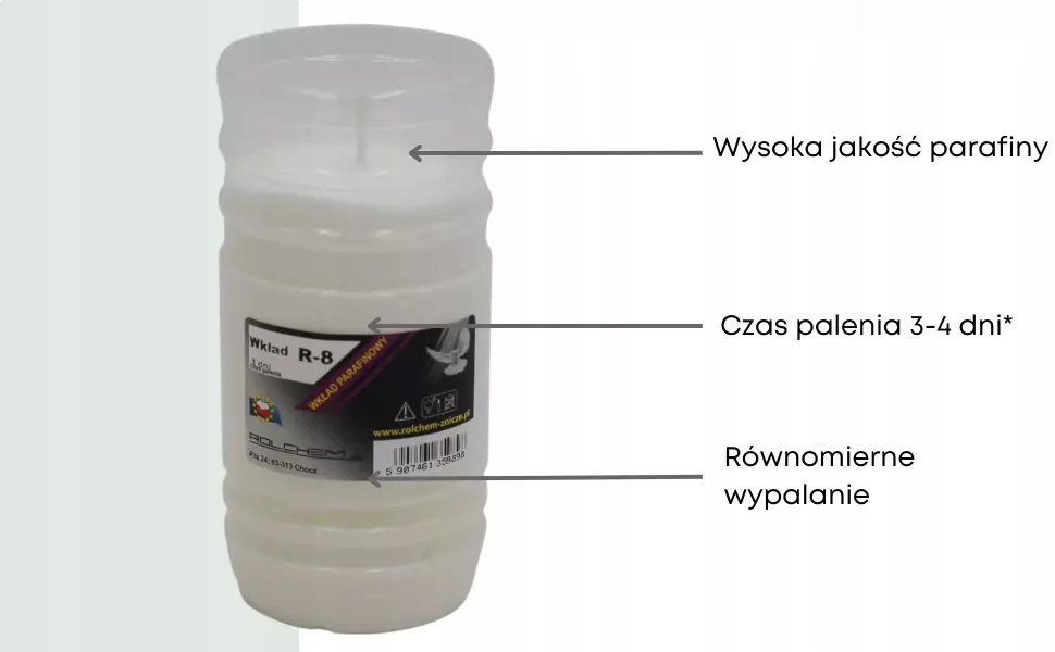 Высокий качественный вклад парафина ROL-CHEM, обеспечивая даже сжигание и длительное освещение. Идеально подходит для вашей свечи для кладбища.