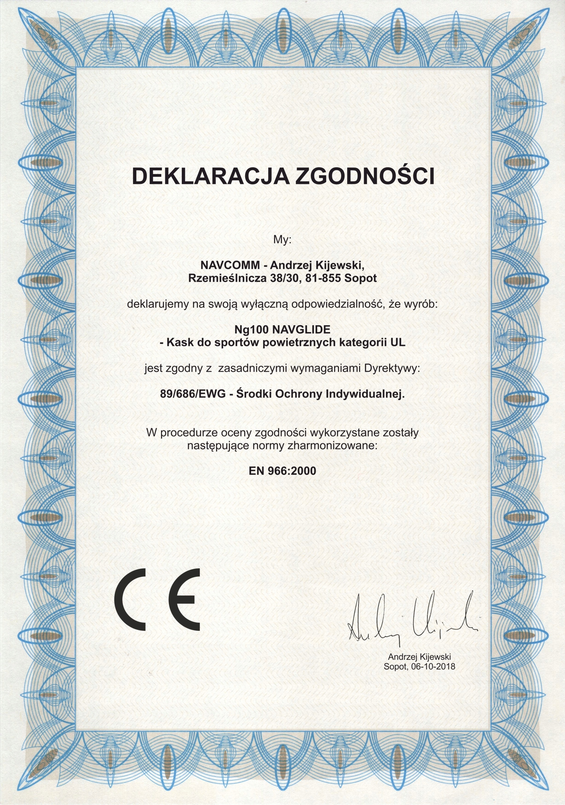 Шлемы NavComm серии NavGlide были разработаны и изготовлены в соответствии с требованиями, указанными в стандарте Польши и ЕС PN-EN 966 2000//A1/2002//Ap1/2004//A2/2006 «Шлемы для воздушных видов спорта», что подтверждено сертификатом оценки типа ЕС № WE/15/002/07, выданным Институтом автомобильного транспорта (уведомлено). Тело № 1582).