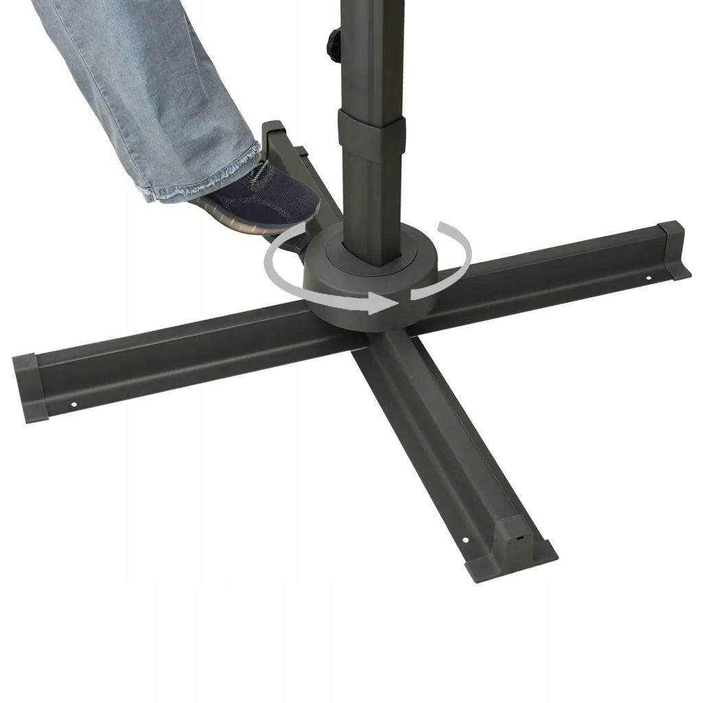 Тент зонта изготовлен из устойчивого к выцветанию полиэстера, который защищает от ультрафиолетового излучения, обеспечивает оптимальную защиту от солнца и легко чистится. Зонт имеет прочное крестообразное основание, которое придает ему устойчивость. Его уникальный дизайн позволяет ему наклоняться и вращаться на 360 градусов, блокируя солнце под любым углом. Прочная алюминиевая стойка с 8 прочными ребрами обеспечивает устойчивость и долговечность. Этот зонт легко открывать и закрывать благодаря кривошипному механизму.