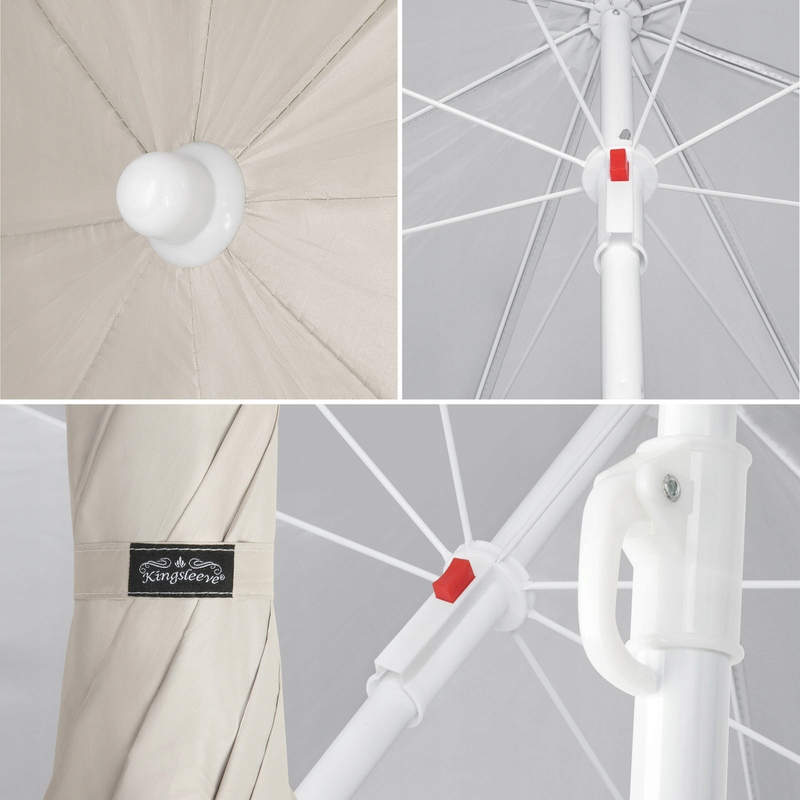 Функция наклона позволяет индивидуально регулировать зонт в зависимости от положения солнца. Благодаря наземному шипу зонт можно закрепить на песке или использовать подставку для зонта (не входит в комплект). Навес зонта изготовлен из водонепроницаемого материала с защитой от солнца UV50+, защищающего от солнца или небольшого летнего дождя. Опоры мачты и зонта изготовлены из стали с порошковым покрытием. Используя крепежный ремень, вы можете легко завязать зонт перед упаковкой и транспортировать его в прилагаемой сумке для переноски. Благодаря практичной сумке и небольшому весу (чуть более 1 кг) зонт идеально подходит для вашего следующего визита на пляж или следующего пикника.