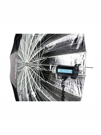 Серебряный параболический зонт Quantuum Space 150 можно использовать как с козырьком, так и без него, позволяя задействовать всю отражающую поверхность. Навес сужает световой поток и увеличивает контраст. Перемещая палочку в патроне лампы, можно фокусировать или расширять световой поток, падающий от зонта на фотографируемый объект.