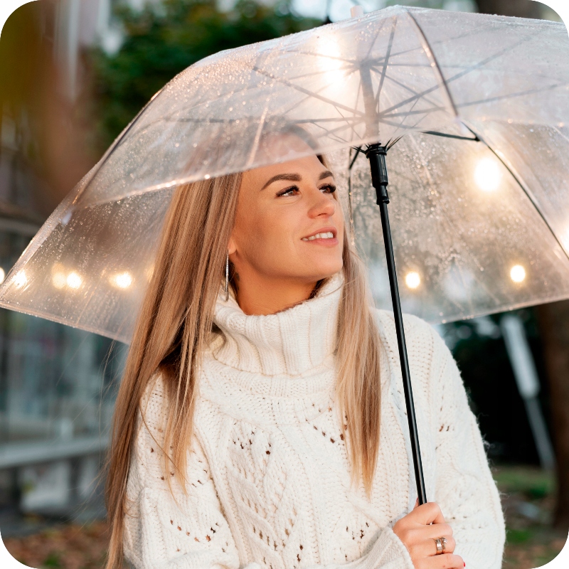 – благодаря прозрачному покрытию изделие очень функционально; человек под зонтиком хорошо виден, что особенно важно во время фото- или видеосессии; задача фотографа или оператора облегчается, а сам зонт становится приятным украшением; гуляя под дождем, можно наблюдать, как капли разбиваются о покрытие зонта, что особенно понравится юным пользователям; это облегчает обзор дороги и повышает безопасность, когда зонт приходится держать под углом из-за сильного проливного дождя.
