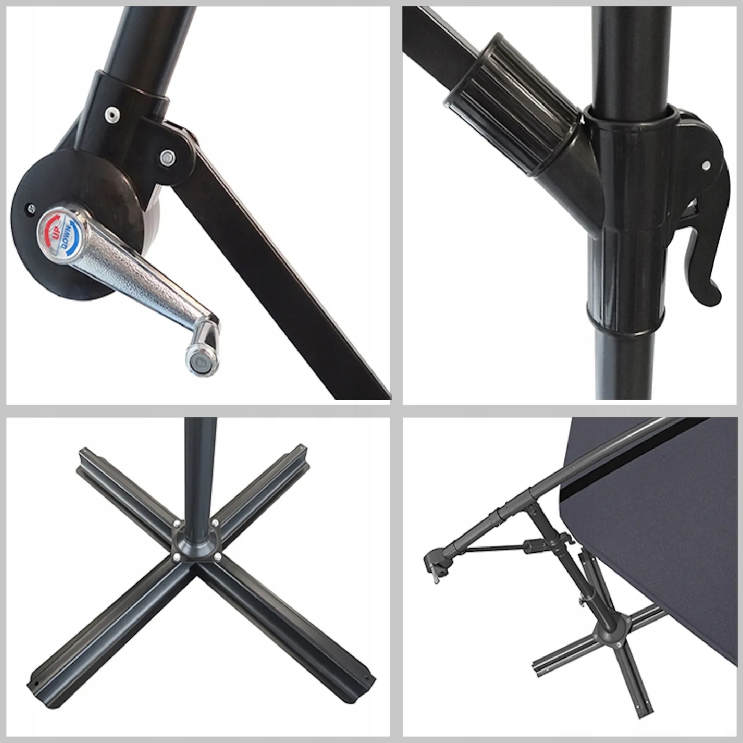 Большим преимуществом зонта является его простота использования. Навес раскладывается с помощью удобной рукоятки. Просто поверните его вправо или влево, и зонтик развернется или сложится. Это чрезвычайно удобное и безопасное решение. В верхней части купола зонта имеется вентиляционное отверстие, позволяющее отводить тепло. Материал навеса водонепроницаем. Прочное металлическое основание имеет удлиненное одно плечо для повышения устойчивости зонта.