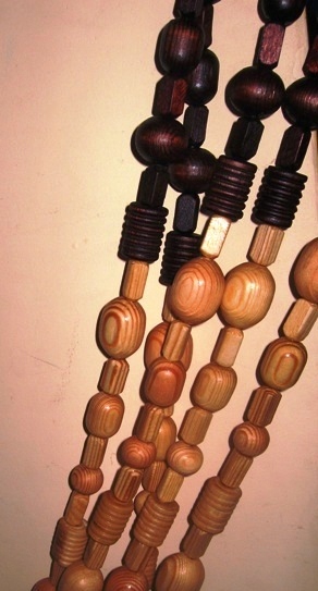 - Бусины нанизаны на веревочки, отделаны деревянной полоска.