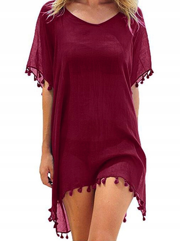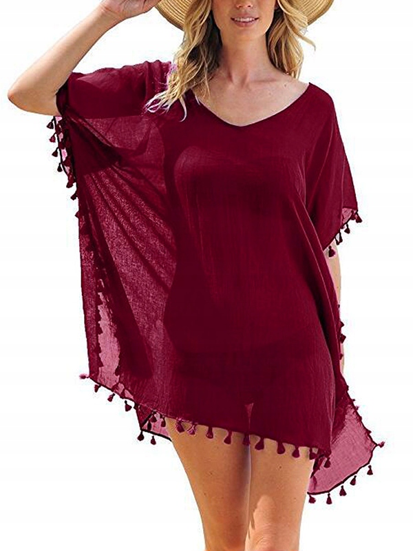 Туника отделана модной бахромой в стиле бохо, крой oversize обеспечивает идеальную посадку на любую фигуру и скрывает недостатки фигуры, подчеркивая летний загар.