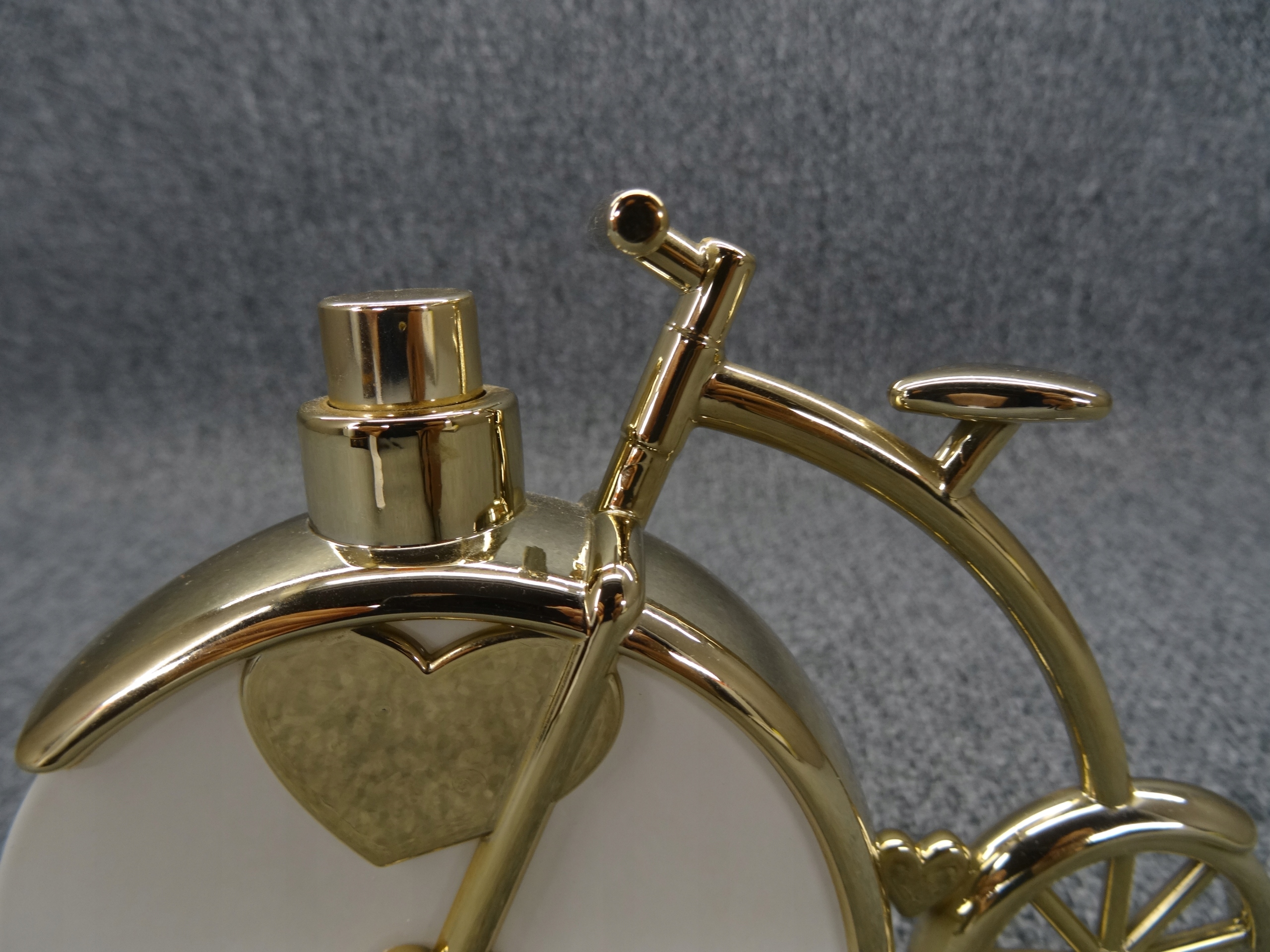 ПАРФЮМЕР, флакон с распылителем духов в форме велосипеда. Флакон почти пустой, осталось немного духов. Контейнер из молочного стекла, велосипед из пластика.
