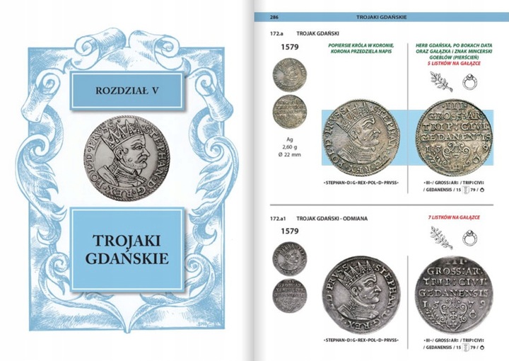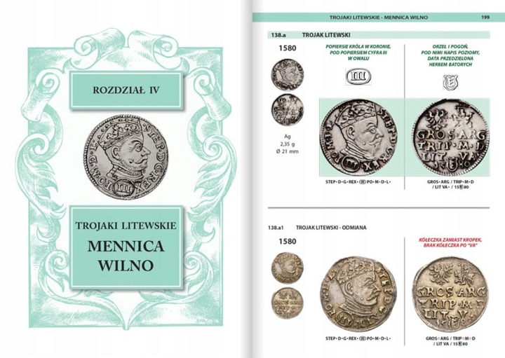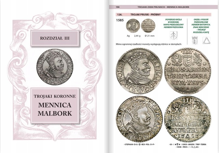 На 350 страницах 591 тройня представлена на высококачественных фотографиях, в натуральную величину и в большие, читаемые увеличенные изображения (Ø 50 мм). Самый популярный на польском рынке тройной каталог Тадеуша Игера описывает 315 монет в случае Стефана Батория в таблицах, из которых он иллюстрирует (только в натуральную величину) только 153 монеты. В представленном каталоге ВСЕ МОНЕТЫ показаны в натуральном размере и увеличении.