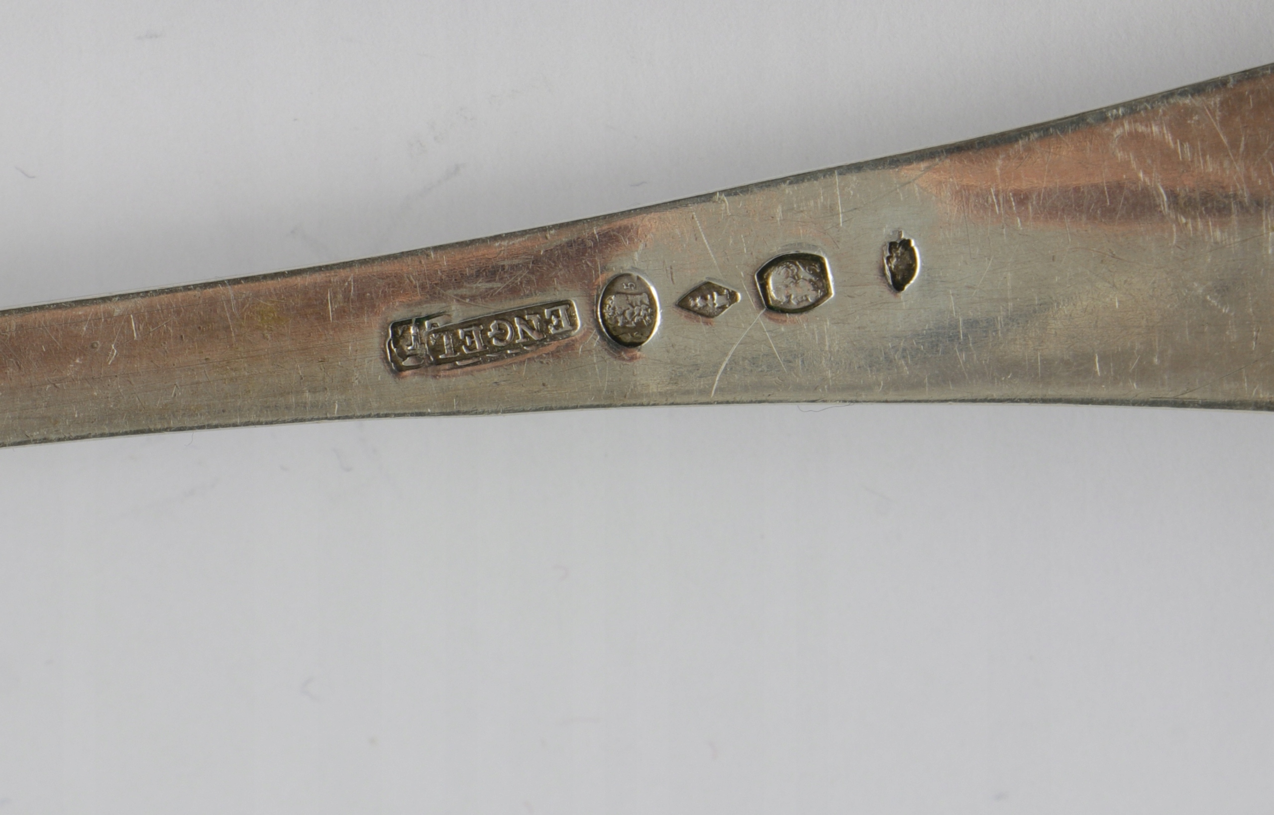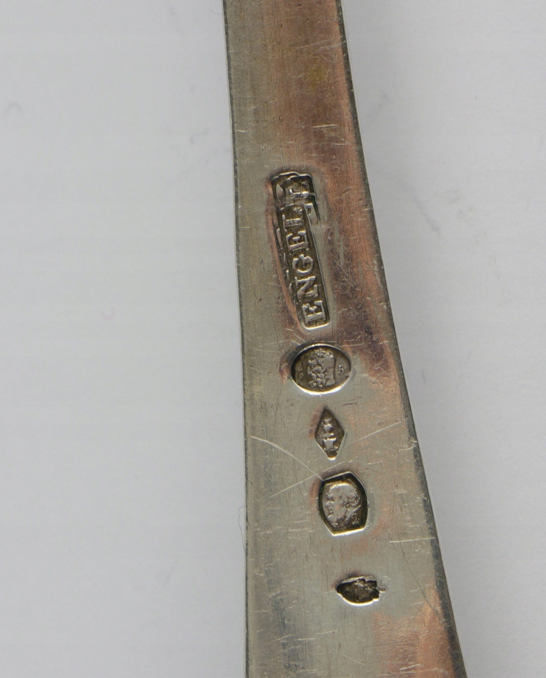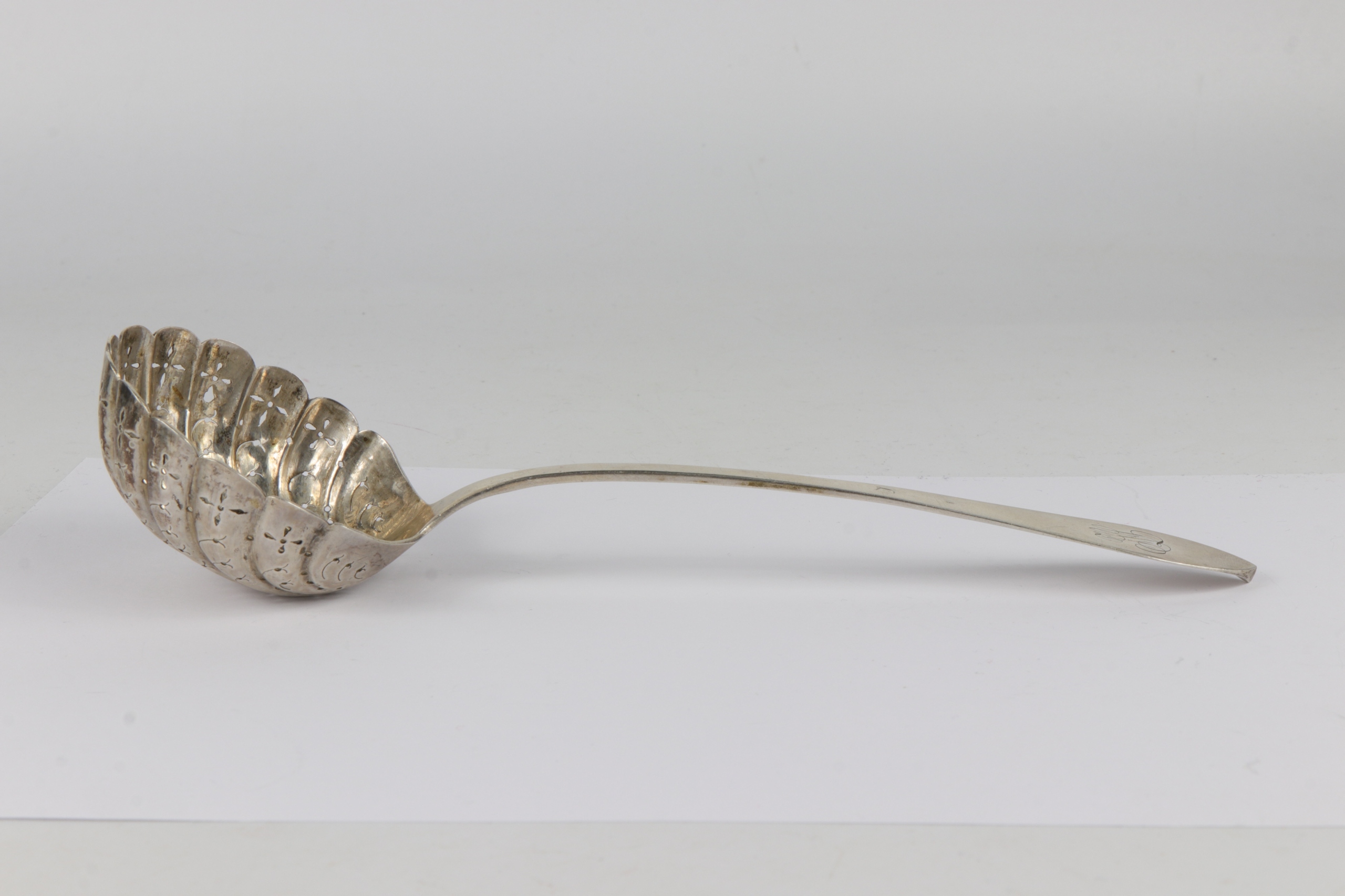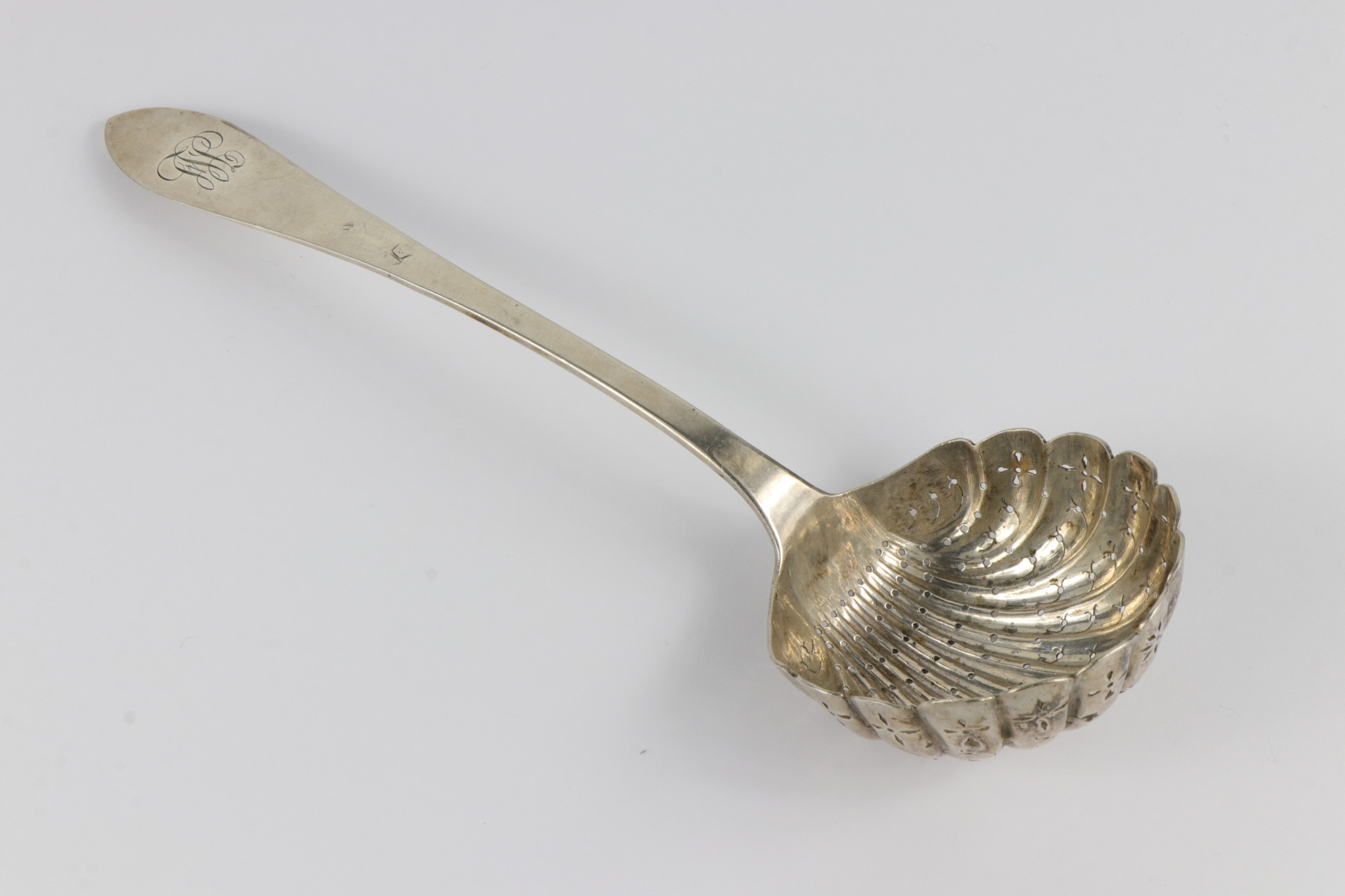 Серебро порошка или фруктовая ложка в рассосе с очень хорошей монограммой. Сильвер подписал с несколькими признаками серебра (глава Сократа и Геркулеса), используемых в 1819 году по 1838 год в Париже. Голова Пунка, используемая до 1819 года