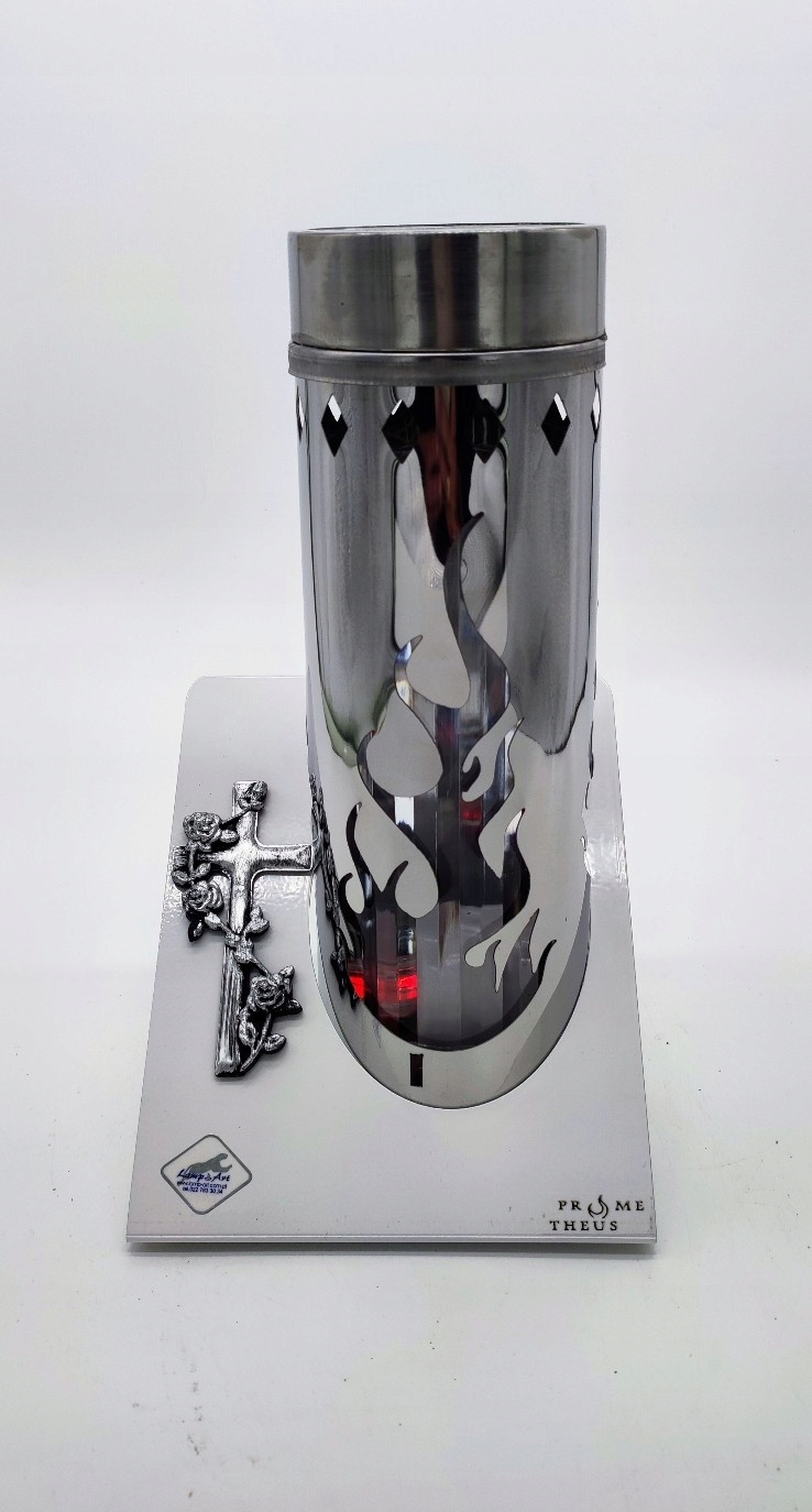 Красивая круглогодичная свеча интересной формы, с ПЛАМЕНЕМ, вырезанным на стальной трубке, и КРЕСТОВЫМ украшением с переплетенной розой на основании
