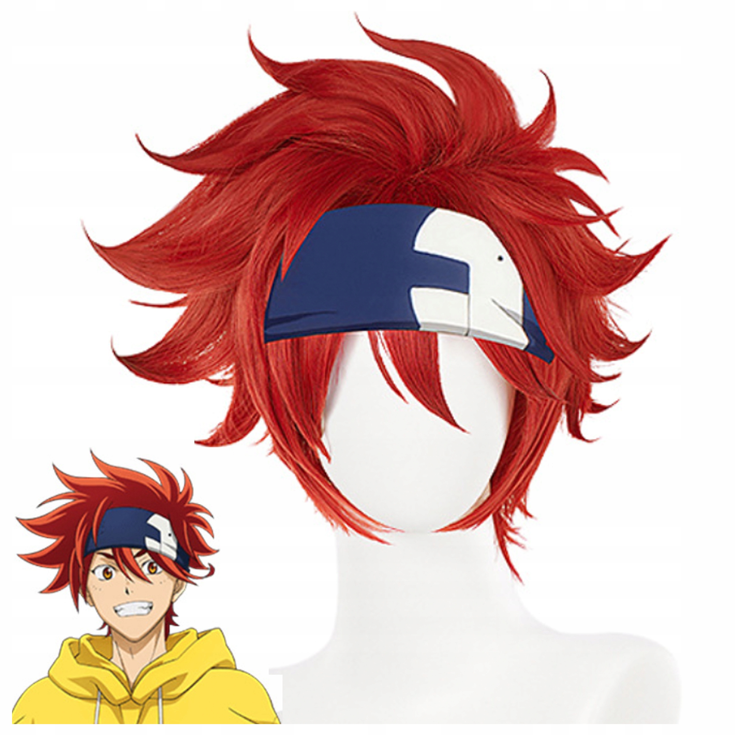 Красивый парик в стиле известного аниме-персонажа. Короткие рыжие волосы с темно-синей повязкой на голову придают парику неповторимый характер и шарм.