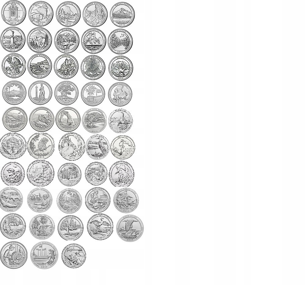 Набор из 56 коллекционных монет номиналом 25 центов (четверть) парков США - начиная с 2010 года Национального парка Хот-Спрингс (Арканзас) и заканчивая новейшим Национальным историческим памятником летчиков Таскиги (Алабама).