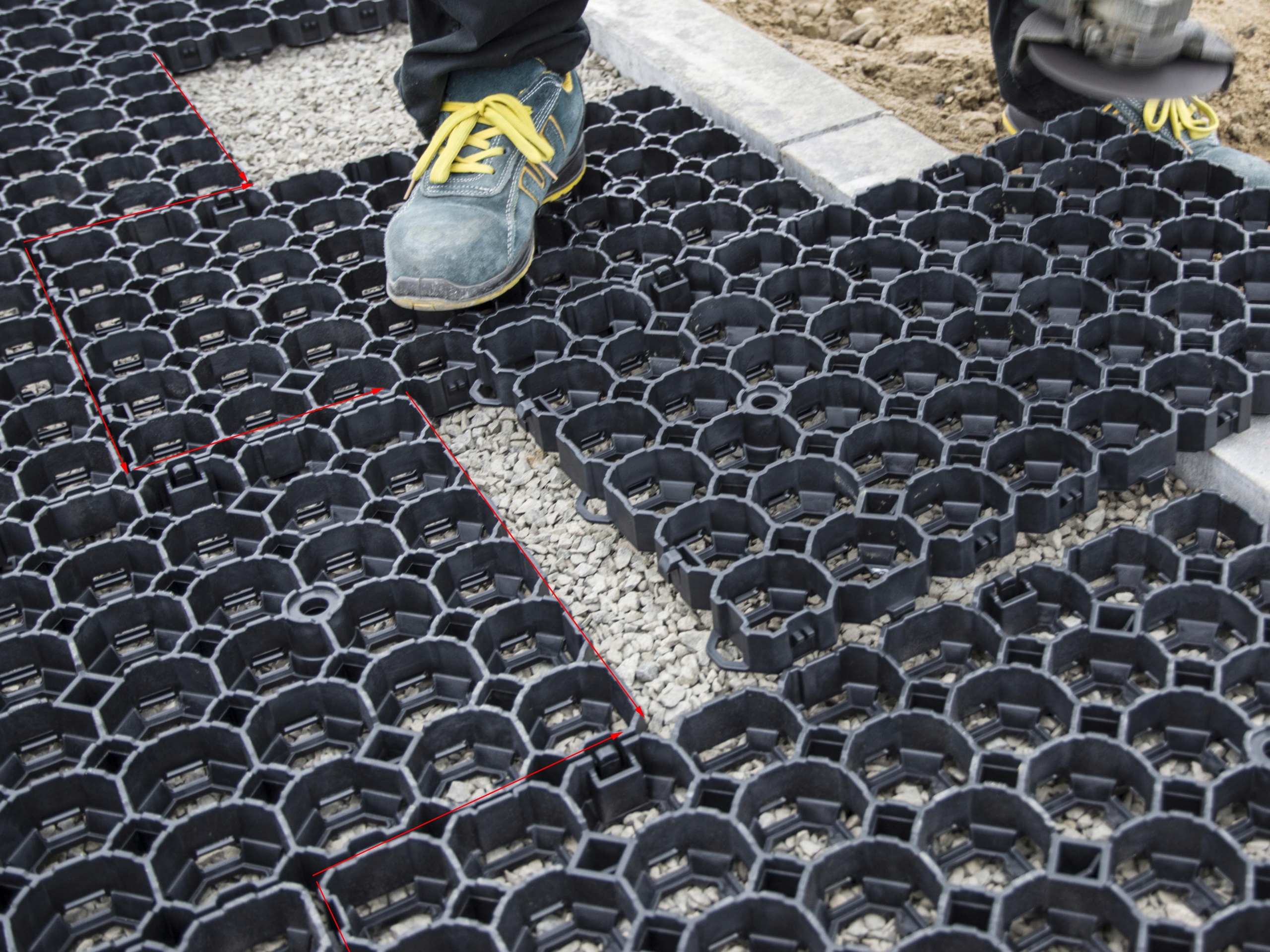 Решетка должна быть размещена с помощью сдвига (на кирпич), это позволяет вам усилить поверхность и долговечность связей в любом направлении использования. На краю области решетка можно разрезать с помощью угловой шлифовальной машины или ручной пилы, адаптируясь к бордюру или краю.