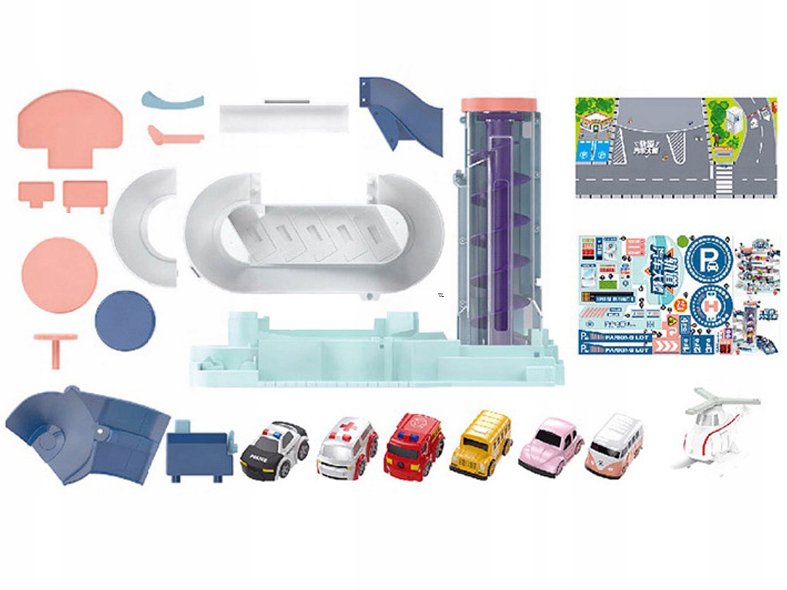 Большой многоуровневый гаражс заправочной станцией, электрическим лифтом и посадочной площадкой для вертолета – набор, который доставит радость каждому маленькому пользователю. Парковка адаптирована для «спрингеров» и содержит множество дополнительных элементов, которые значительно разнообразят веселье, таких как наклейки, выезды, проезды и фольгированный коврик с городком, который можно разместить в качестве декора под нашей парковкой.