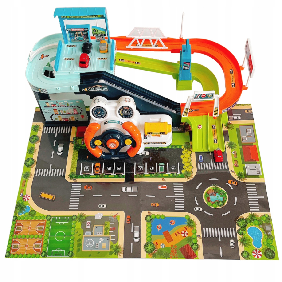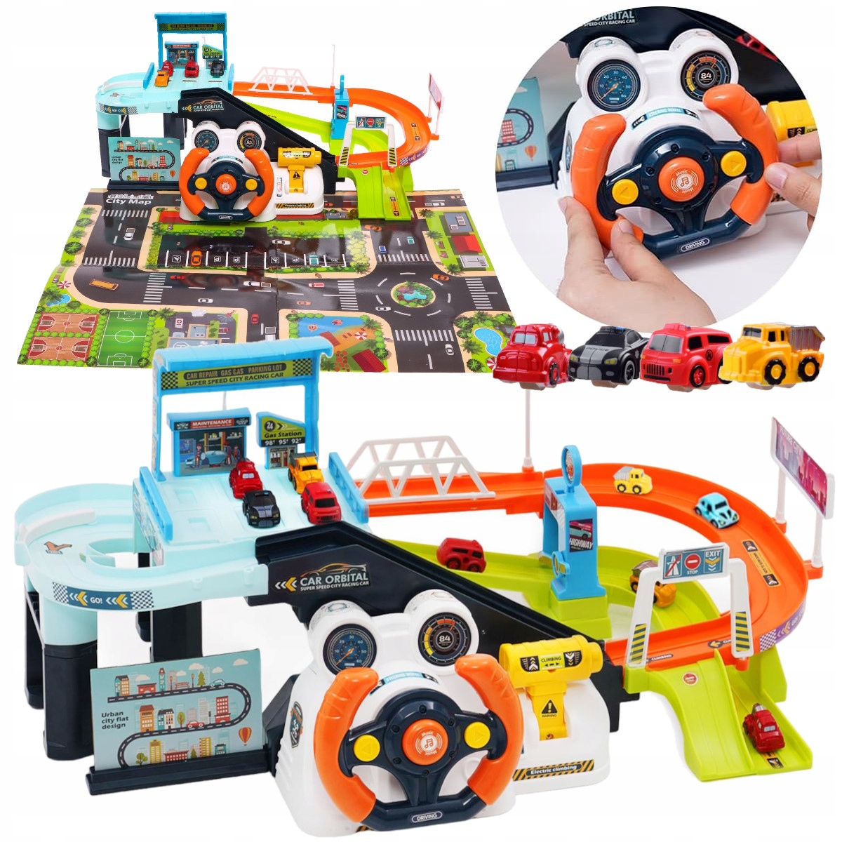 Это не обычный автомобильный трек. Предлагаемая горка имеет площадку с парковкой на 6 машин и заправочную станцию. На трассе имеется специальный механизм, который направляет автомобили к лифту или горке. Интерактивное рулевое колесо подвижно и имеет кнопки со звуковыми эффектами.