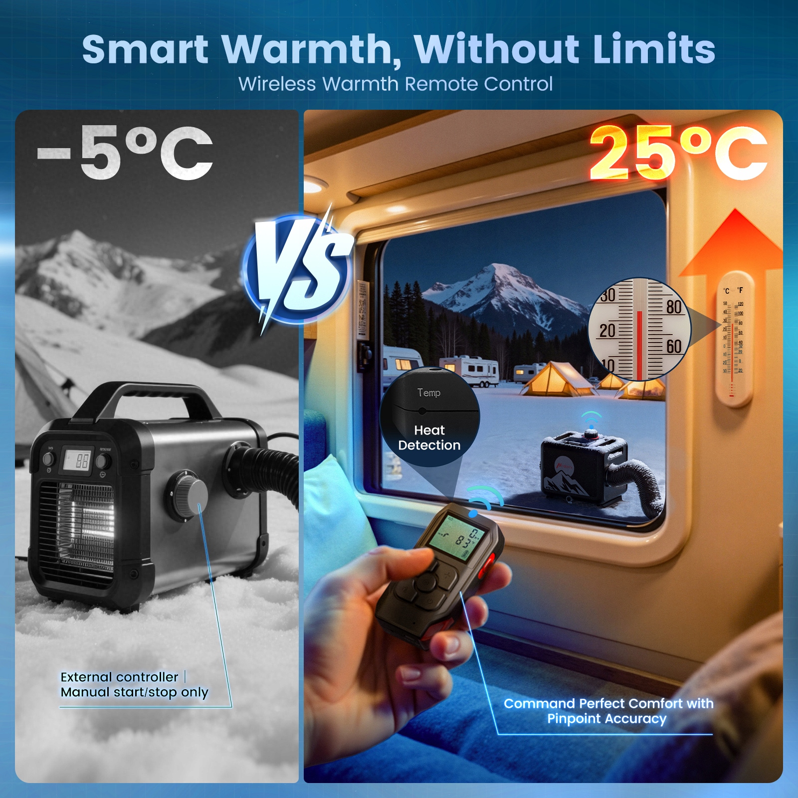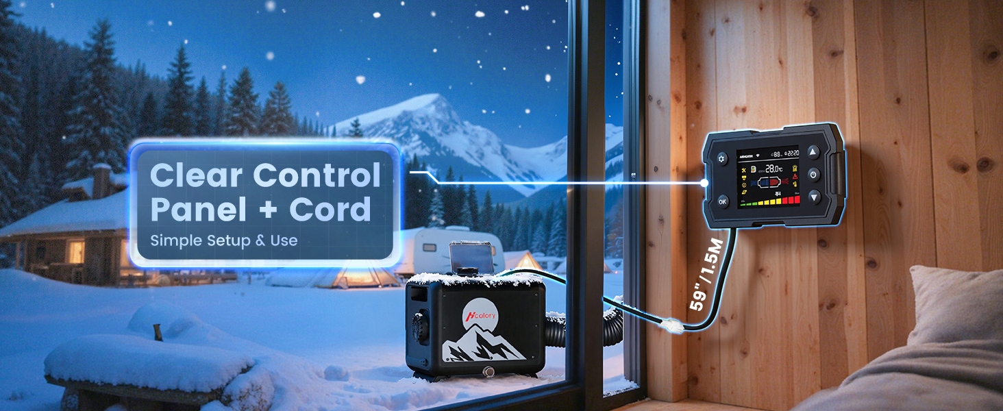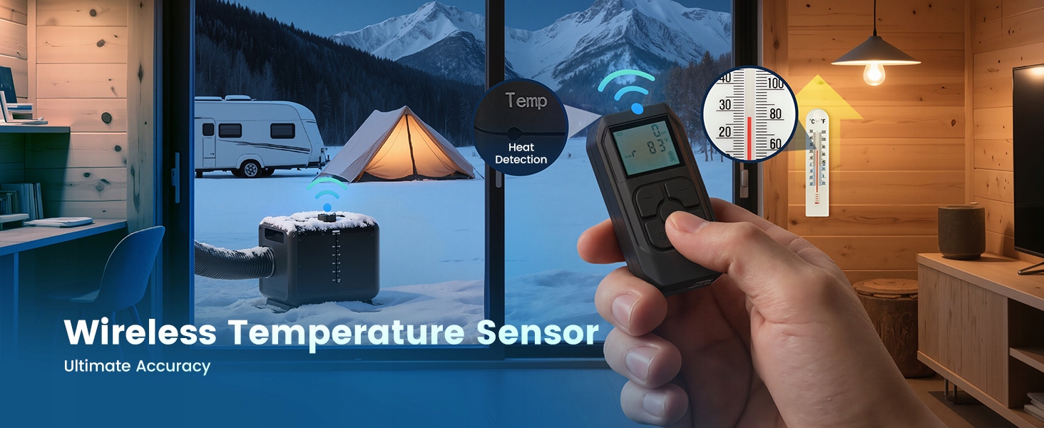 【Настоящий дистанционный контроль температуры】Беспроводной пульт дистанционного управления Он также работает как внутренний термостат, измеряя фактическую температуру в помещении для точного контроля. Разместите обогреватель снаружи палатки, кемпера или домика и просто проложите нагревательный канал внутрь. Это обеспечивает более безопасную, тихую и эффективную установку, поскольку основной блок больше не занимает место в гостиной. Наслаждайтесь идеально автоматизированным комфортом, который адаптируется к температуре в комнате, а не к тому, где расположен радиатор.