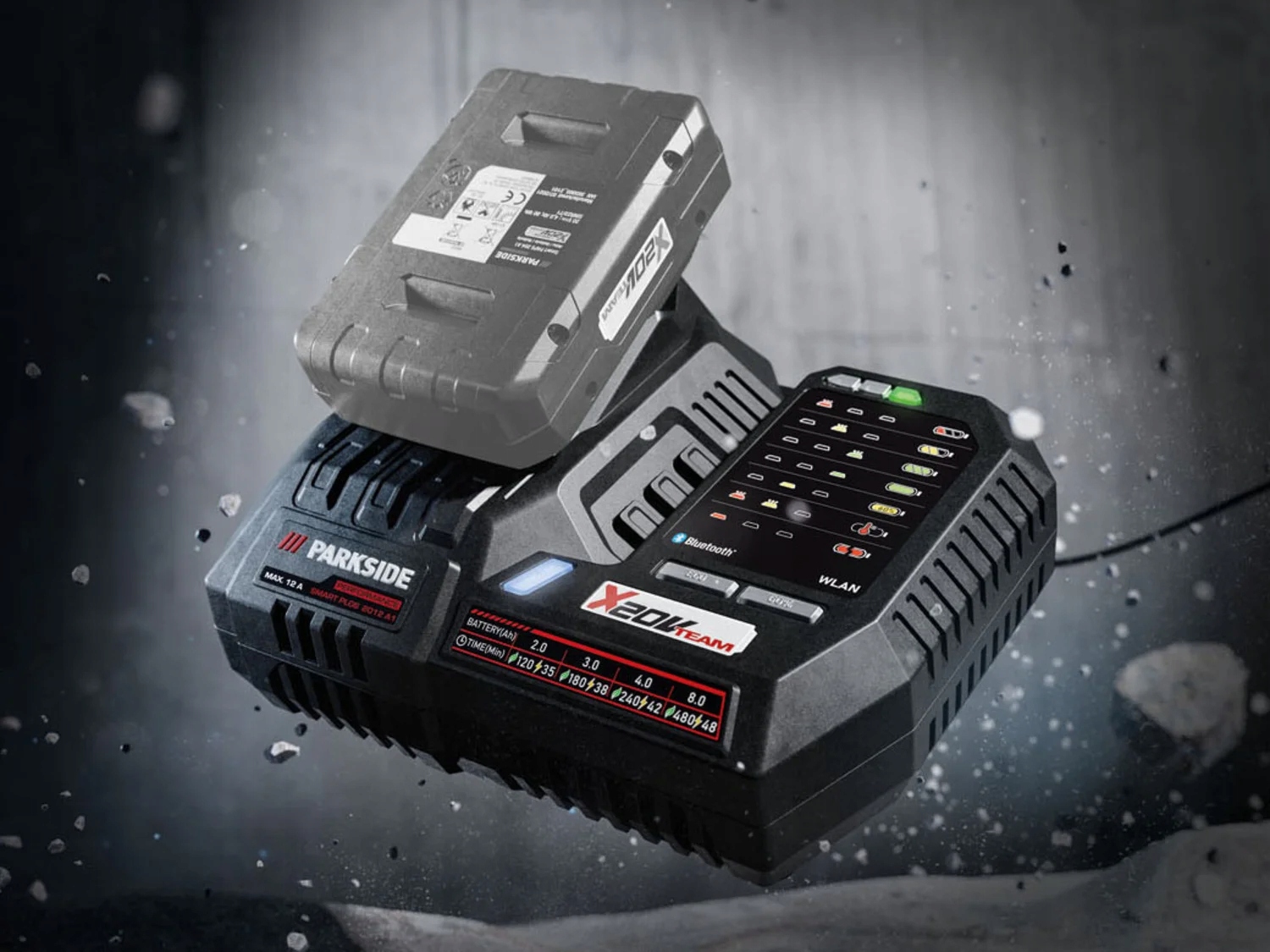 - считывание данных, отправка информации на мобильный телефон и настройка профили зарядки через WLAN или Bluetooth® с помощью приложения PARKSIDE