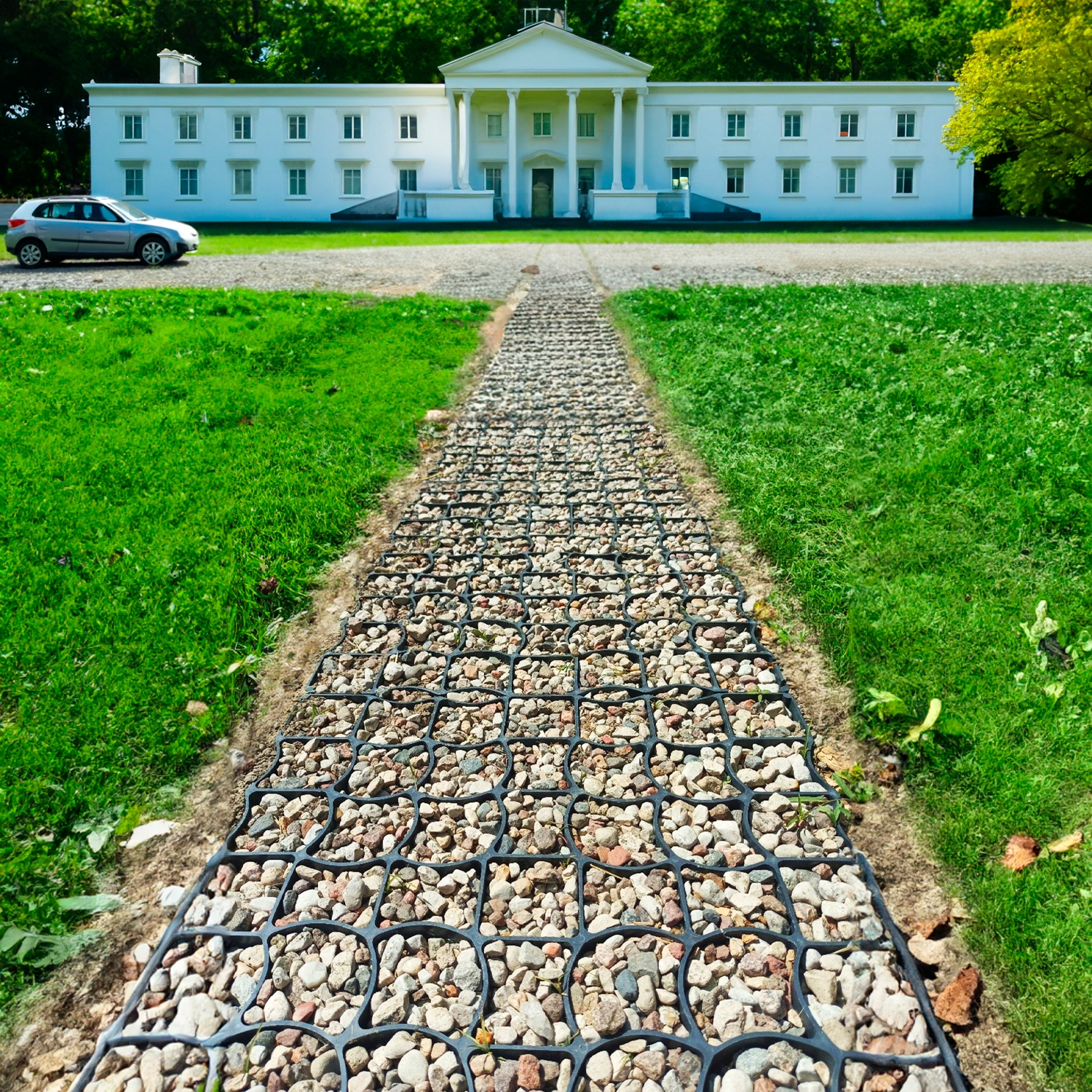 ✅ Контроль грязи! - Благодаря силе тяжести вода может свободно течь и впитываться в землю, избегая образования грязных мест и удары. Раньше причиной образования грязи были гравийные дороги, но использование решетчатой системы позволяет эффективно отводить воду с поверхности.