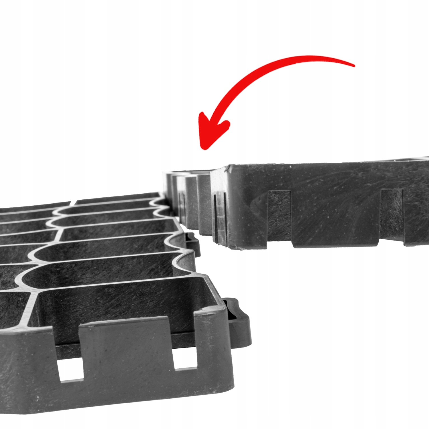 Парковочная решетка размером 500 х 500 мм имеет с обеих сторон выступающие крючки и специально подготовленные углубления в стене с обеих сторон. Соединение осуществляется путем вставки крючка в углубление.