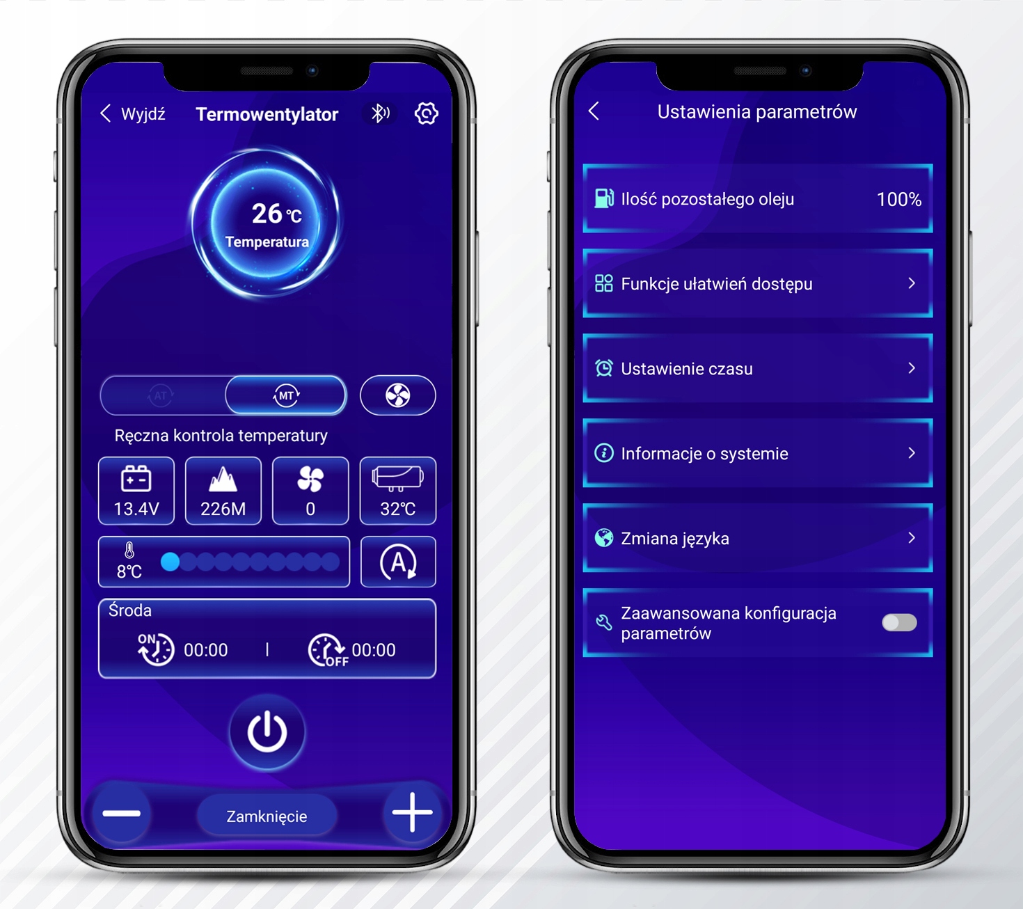 ✅ Мобильное приложение на польском языке (Android и iOS). Удобно управляйте обогревом с телефона: запуск, выключение, регулировка мощности и таймер. Приложение понятное, интуитивно понятное и полностью на польском языке.