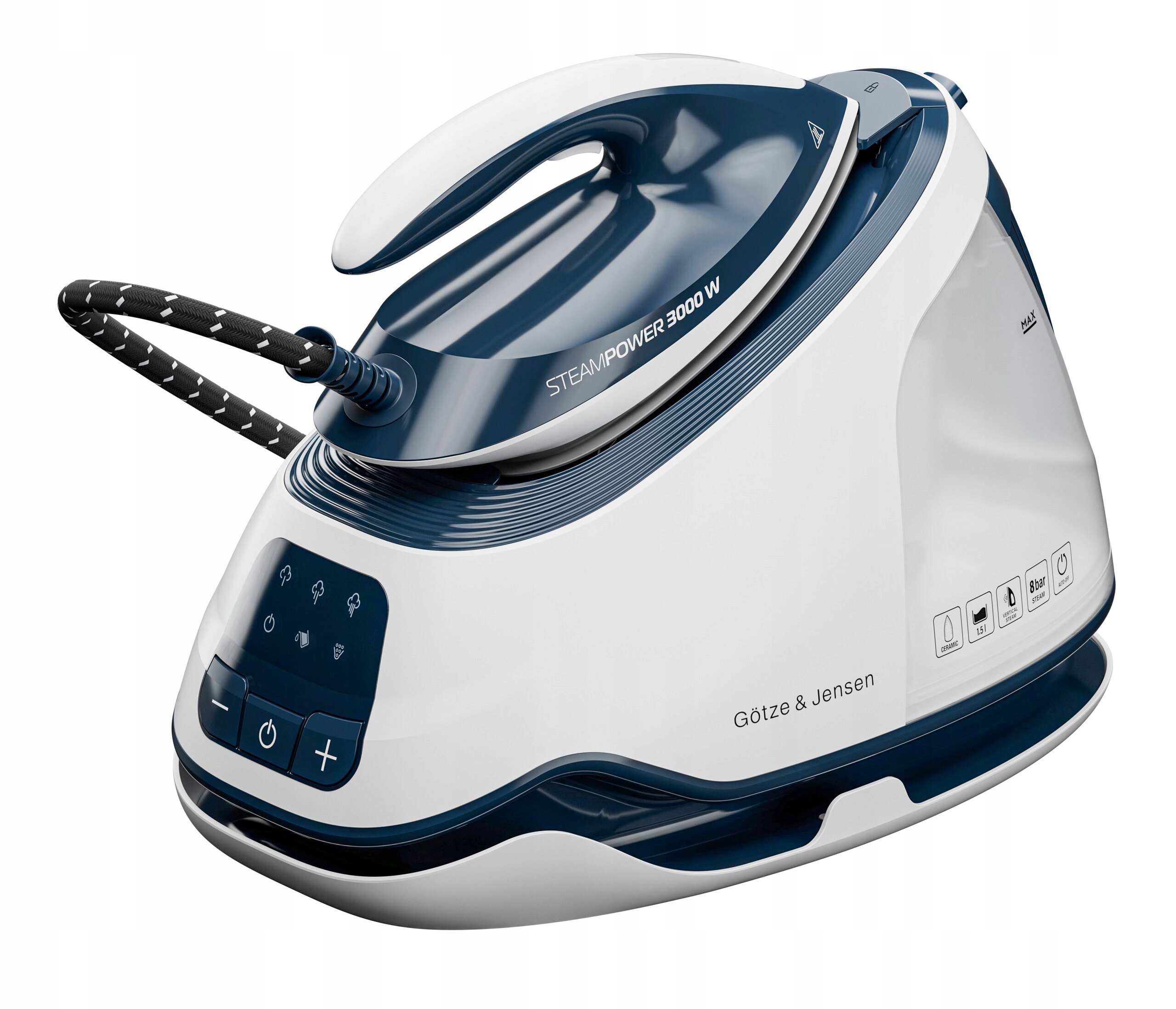 Парогенератор GÖTZE & JENSEN мощностью 3000 Вт и емкостью бака. Станция имеет бак емкостью 1,5 литра, что позволяет непрерывно гладить до 2 часов без необходимости долива воды во время использования. Парогенератор обеспечивает глажение с использованием пара высокого давления до 8 бар. Автоматическое отключение утюга после 10 минут бездействия.