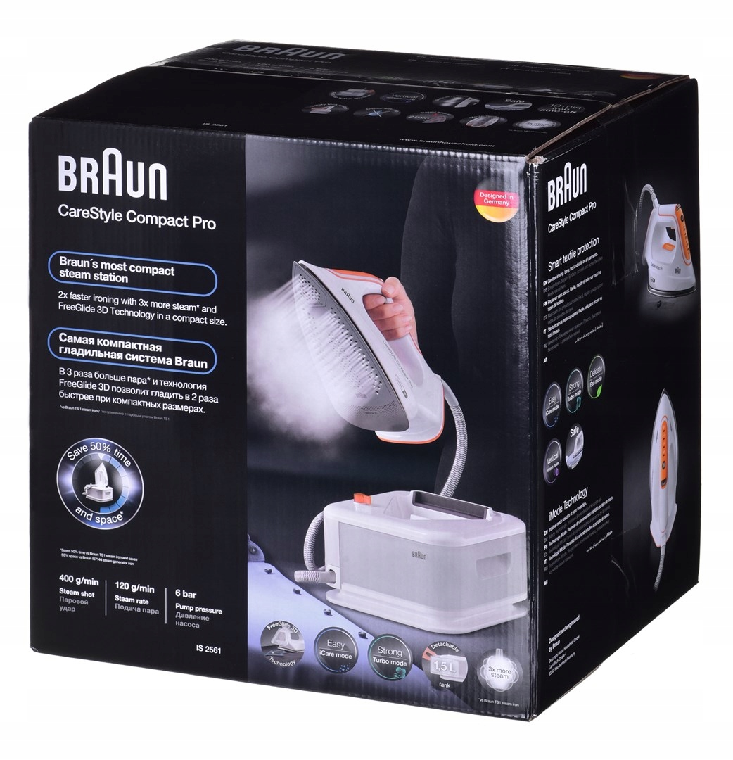 Паровая станция BRAUN CareStyle Compact Pro IS 2561 – это оборудование, превращает утомительное глажение в легкое, быстрое и приятное занятие. Оснащенный рядом инновационных технологий, утюг с парогенератором не только сократит время глажки вдвое, но и гарантирует результаты, превосходящие результаты традиционных паровых утюгов. Это связано, среди прочего, с паровая система, производящая в 3 раза больше пара (по сравнению с паровыми утюгами Braun TS 1). И больше пара = меньше движений, необходимых для разглаживания складок.