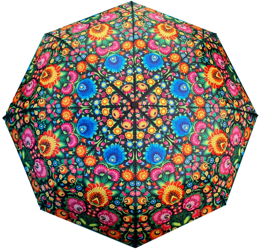 Зонт с яркими цветами из выреза из Ловича на черном фоне.