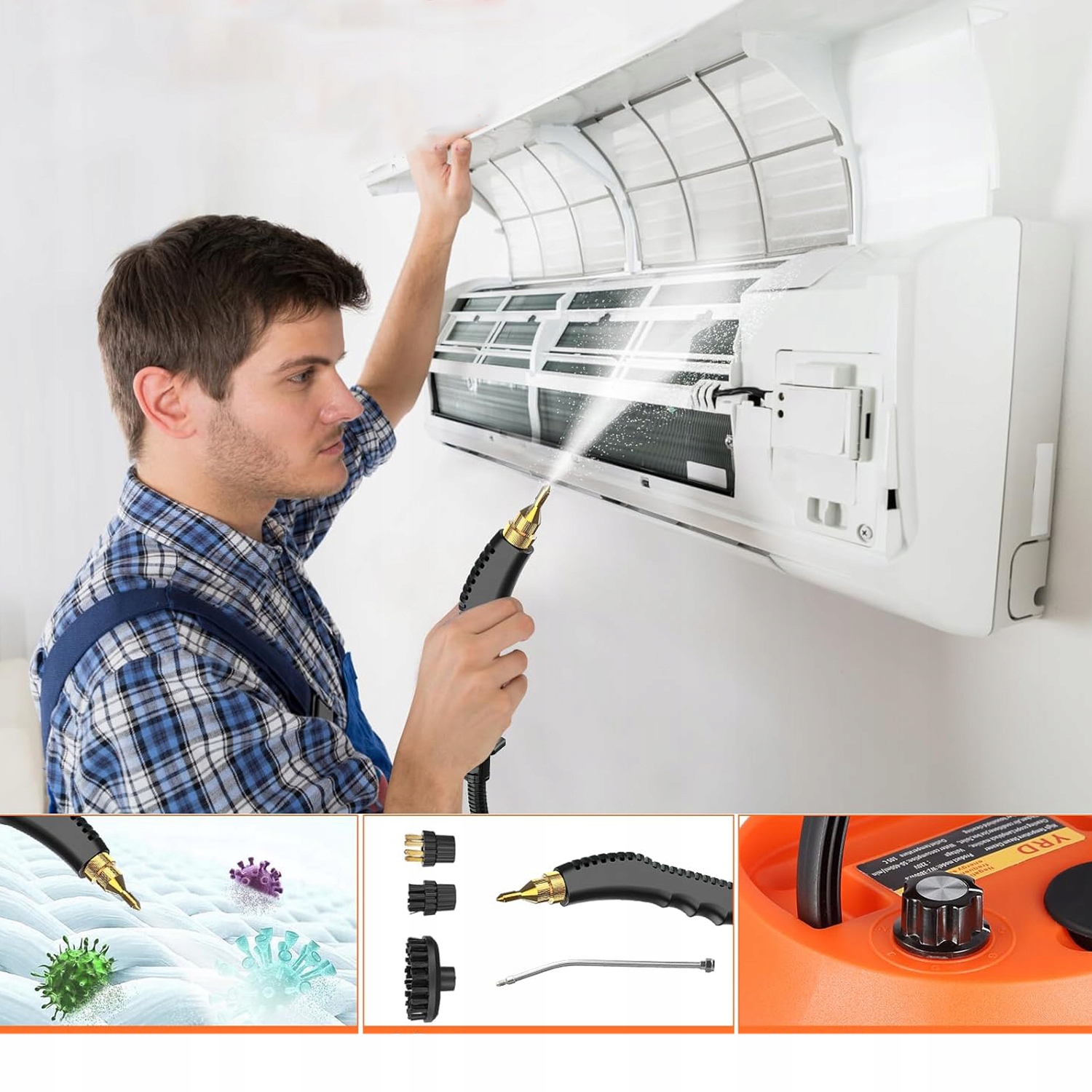 ✅ Эта паровая машина может производить пар высокой температуры 105 ℃ примерно за 10 секунд, создавая высокую скорость и сильную очищающую способность, быстро растворяя пятна и очищая масло и пыль. (Примечание: во время чистки надевайте термостойкие перчатки.)