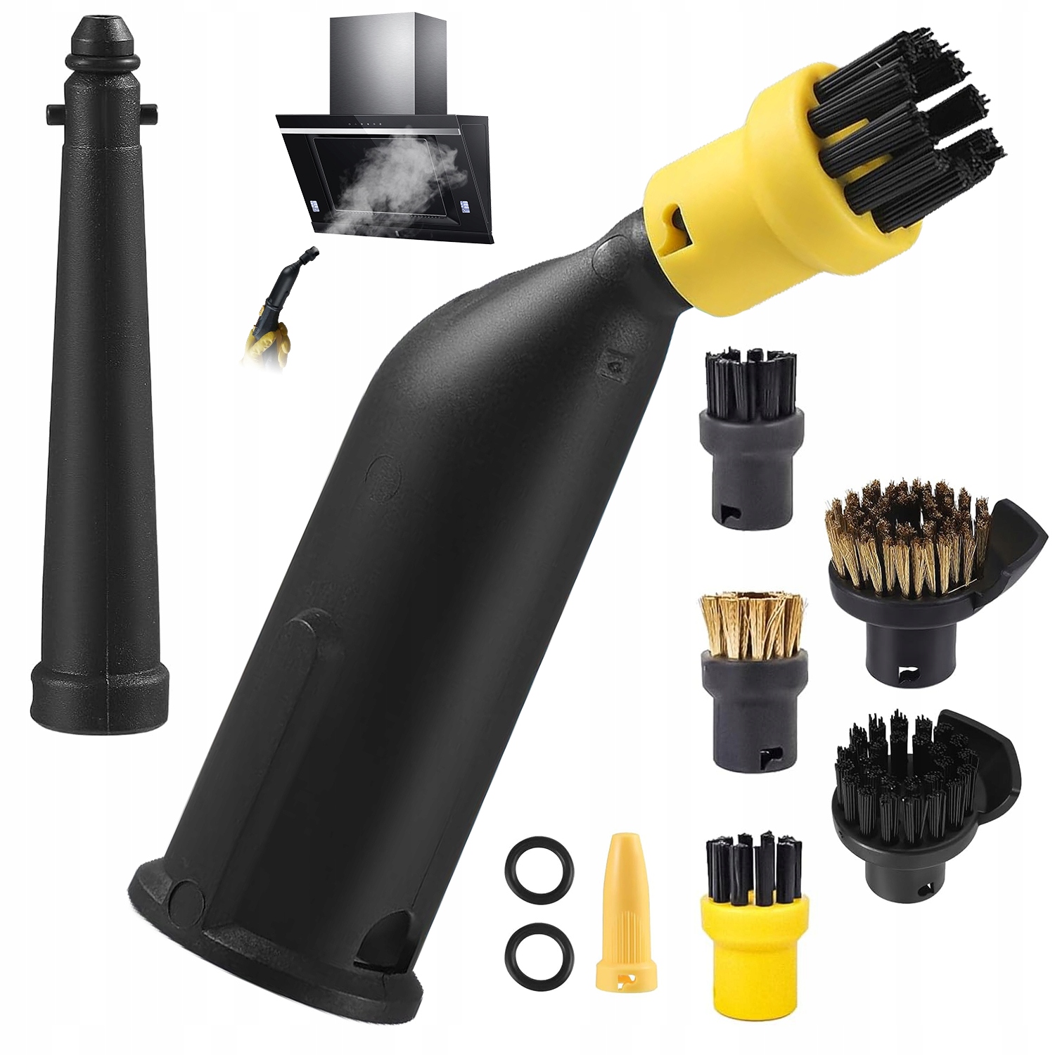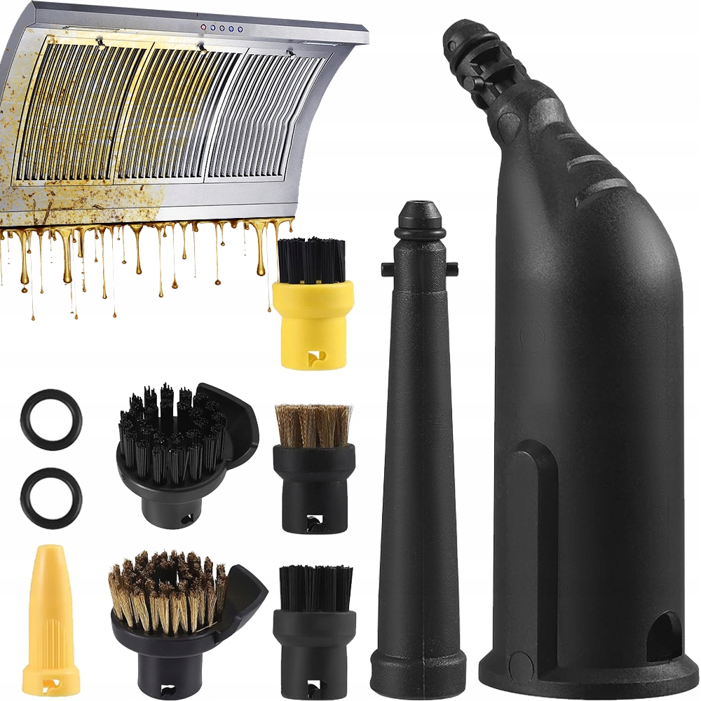 - 2 нейлоновые круглые насадки, 1 медная круглая насадка, 1 черная удлиненная насадка, 1 изогнутая насадка, 1 желтая насадка, 1 медная чистящая щетка со скребком, 1 нейлоновая чистящая щетка со скребком, 2 черных уплотнительных кольца