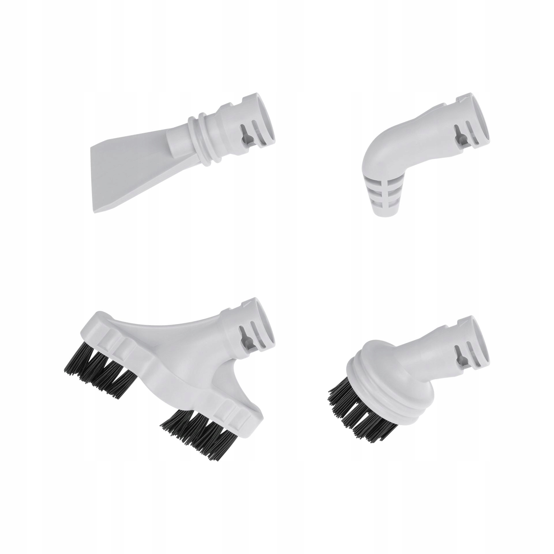 В комплект входят: 2 насадки для мытья полов, насадка для ковров, мерный стакан, адаптер, круглая щетка, насадка для затирки швов, насадка для щелей, скребок