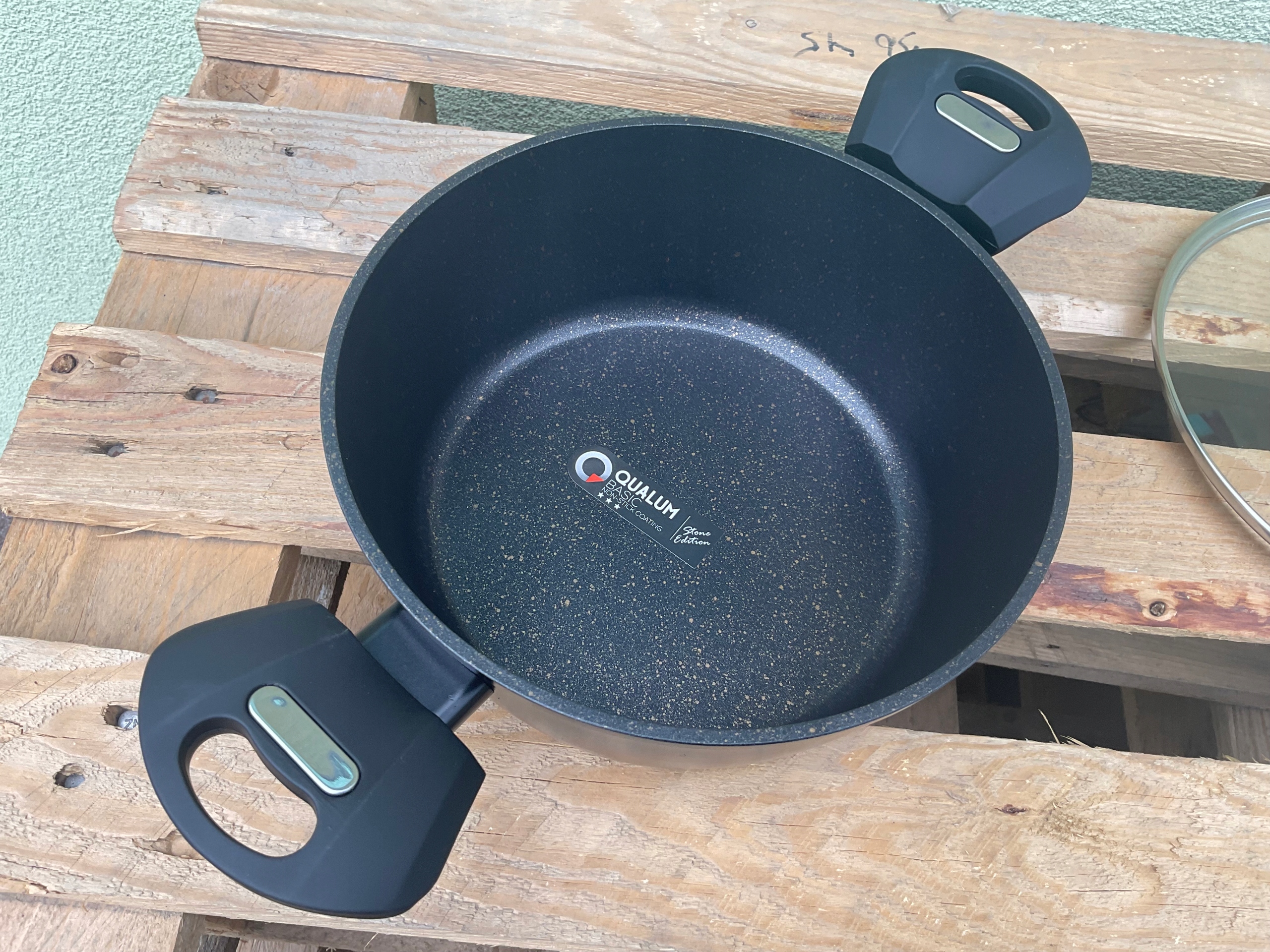 Алюминиевая основа, внутри покрыта антипригарным покрытием Qualum Basic Stone Edition, имитирующим камень (в крапинку золота).