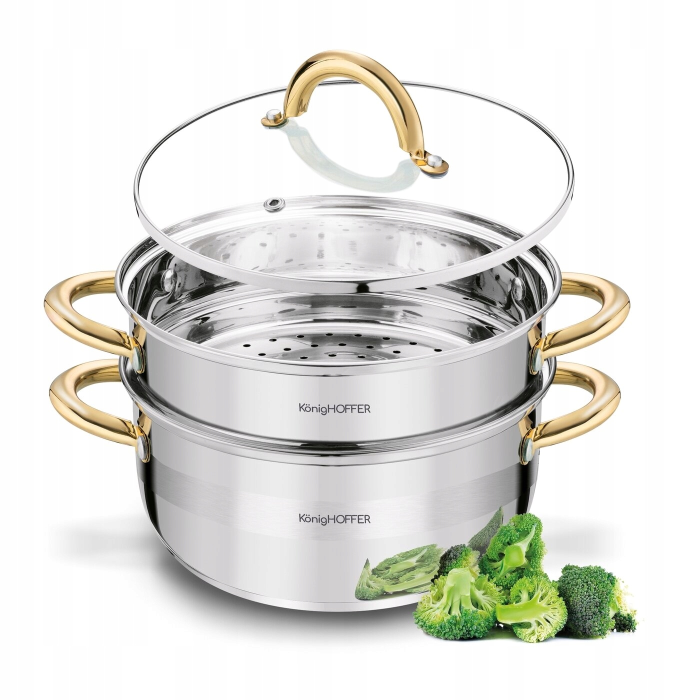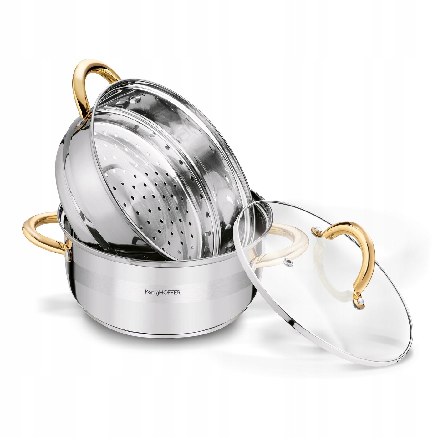 Кастрюля-пароварка Konighoffer Faro Gold объемом 2,9 л. Изделие изготовлено из прочной нержавеющей стали и оснащено приклепанными ручками. Он состоит из 3-х элементов и за ним легко ухаживать (только ручная стирка). В такой кастрюле со съемным ситечком вы сможете приготовить легкоусвояемые и полезные блюда для своих близких. Вы можете использовать его для приготовления различных ингредиентов, включая мясо, пельмени и овощи. Более того, блюда можно готовить на пару независимо от типа плиты. Это связано с тем, что дно кастрюли приспособлено для использования на индукционных, керамических, электрических и газовых плитах. Прочное крепление ручек обеспечит безопасность при переноске и надежный захват. Одним словом, вы получите прочную и энергосберегающую кастрюлю-пароварку, которую после снятия ситечка можно использовать как классическую суповую кастрюлю. В комплект входит специальная стеклянная крышка. Благодаря ему вы лучше сохраните в пище ценные микроэлементы и витамины и обеспечите сочность ингредиентов.