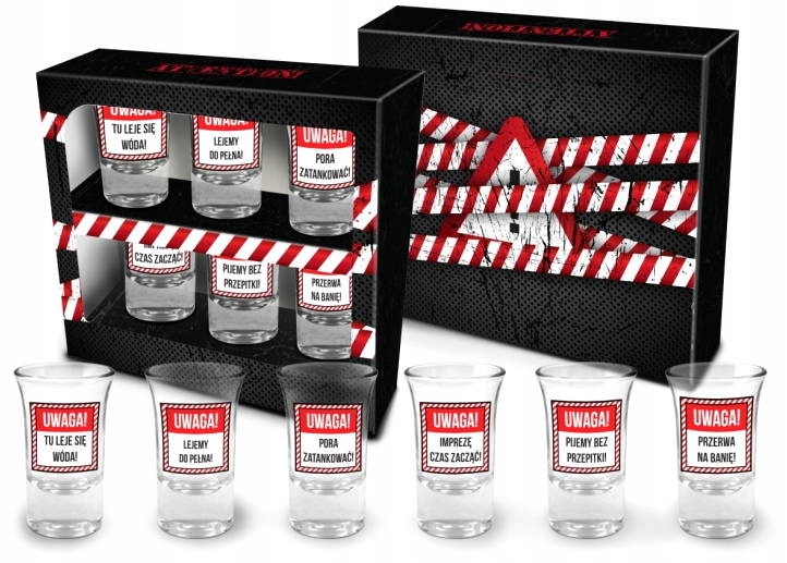 Набор из шести стеклянных стаканов с предупреждающими надписями.