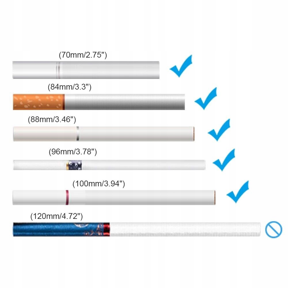 🚬 【Большая вместимость】 Вмещает пачку из 20 сигарет целиком, подходит для 20 сигарет королевского размера размером 84–100 мм каждая. Держатель для всей пачки.