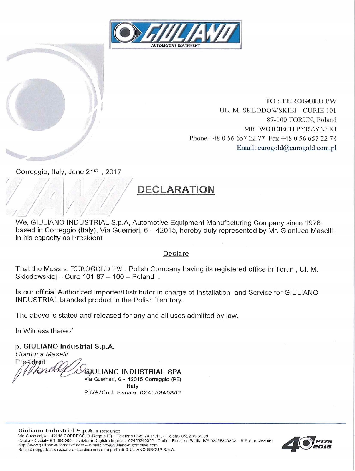 Мы ЕДИНСТВЕННЫЙ авторизованный дистрибьютор итальянской компании GIULIANO в Польше! Покупая у нас, вы можете быть уверены, что оборудование от надежного источника и произведено в Италии!