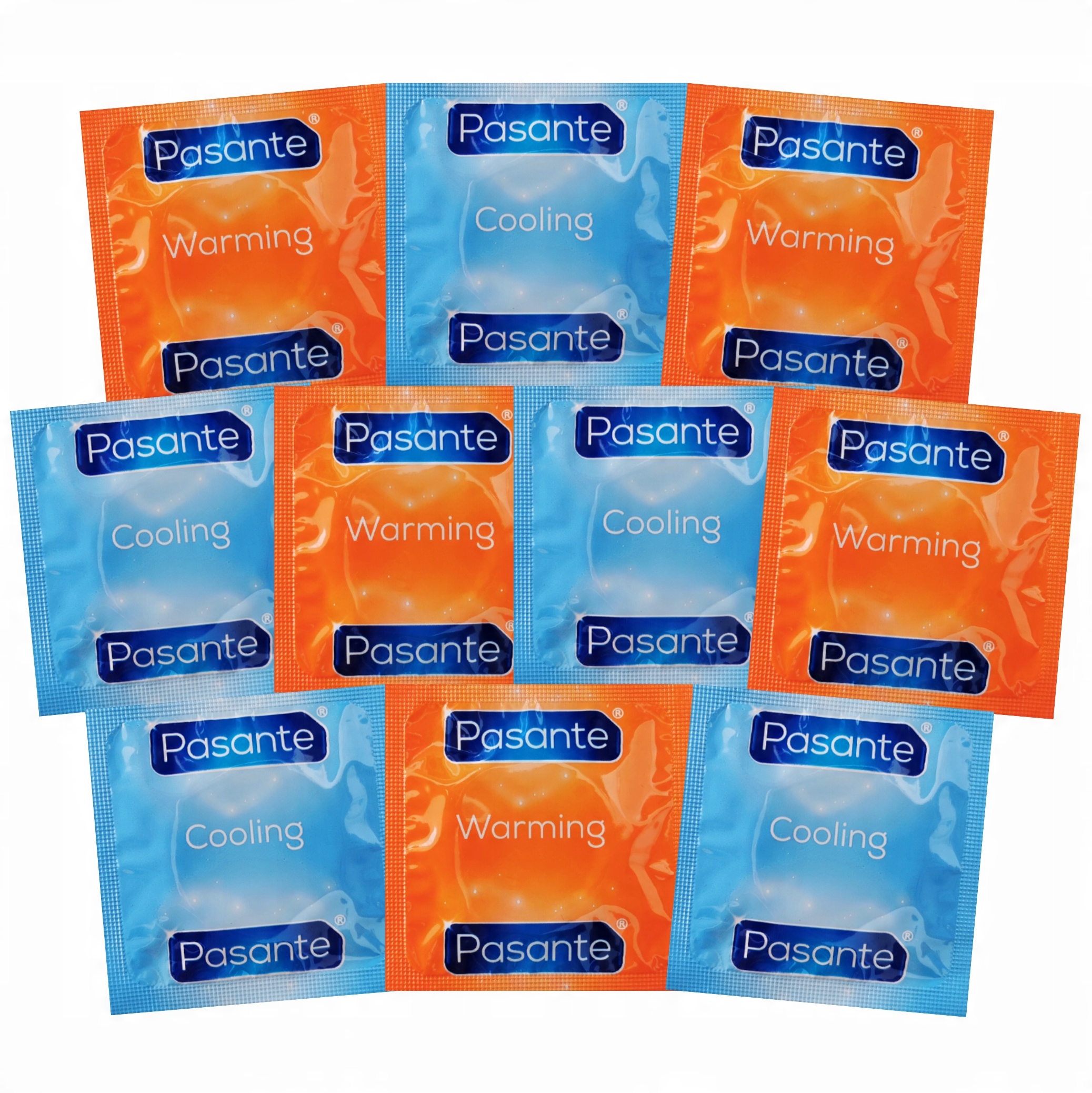- Pasante Cooling & Warming увлажняются специальной охлаждающей и согревающей смазкой, увеличивая удовольствие обоих партнеров. Они имеют анатомическую форму, которая подстраивается под член и позволяет удобно надевать презерватив. Для удобства у них есть дополнительные полосы.