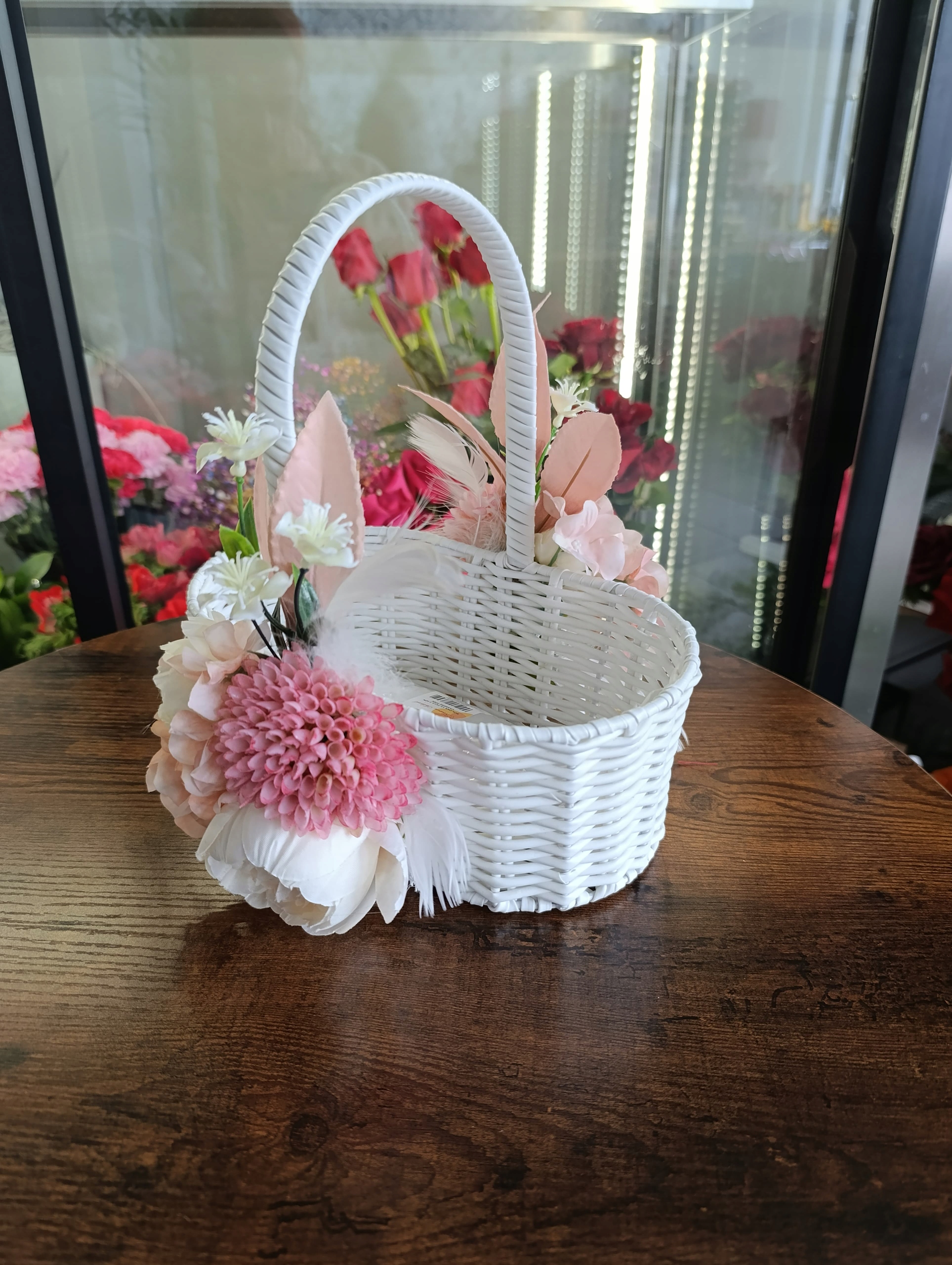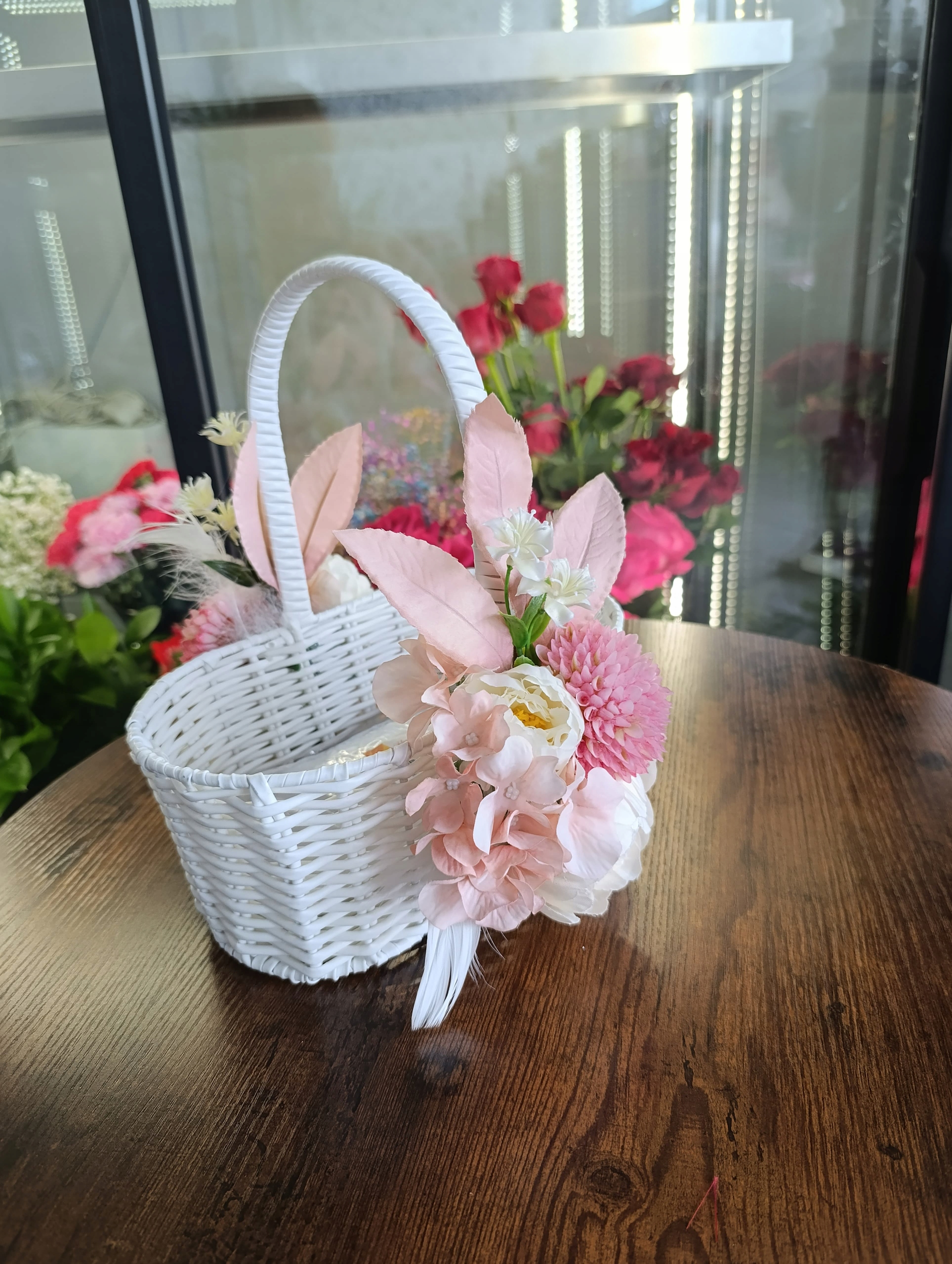Оригинальная, запатентованная композиция, изготовленная вручную в флористической мастерской 2.0 h2> Белая пасхальная корзина с украшением украшения в оттенках розового и белого h2>