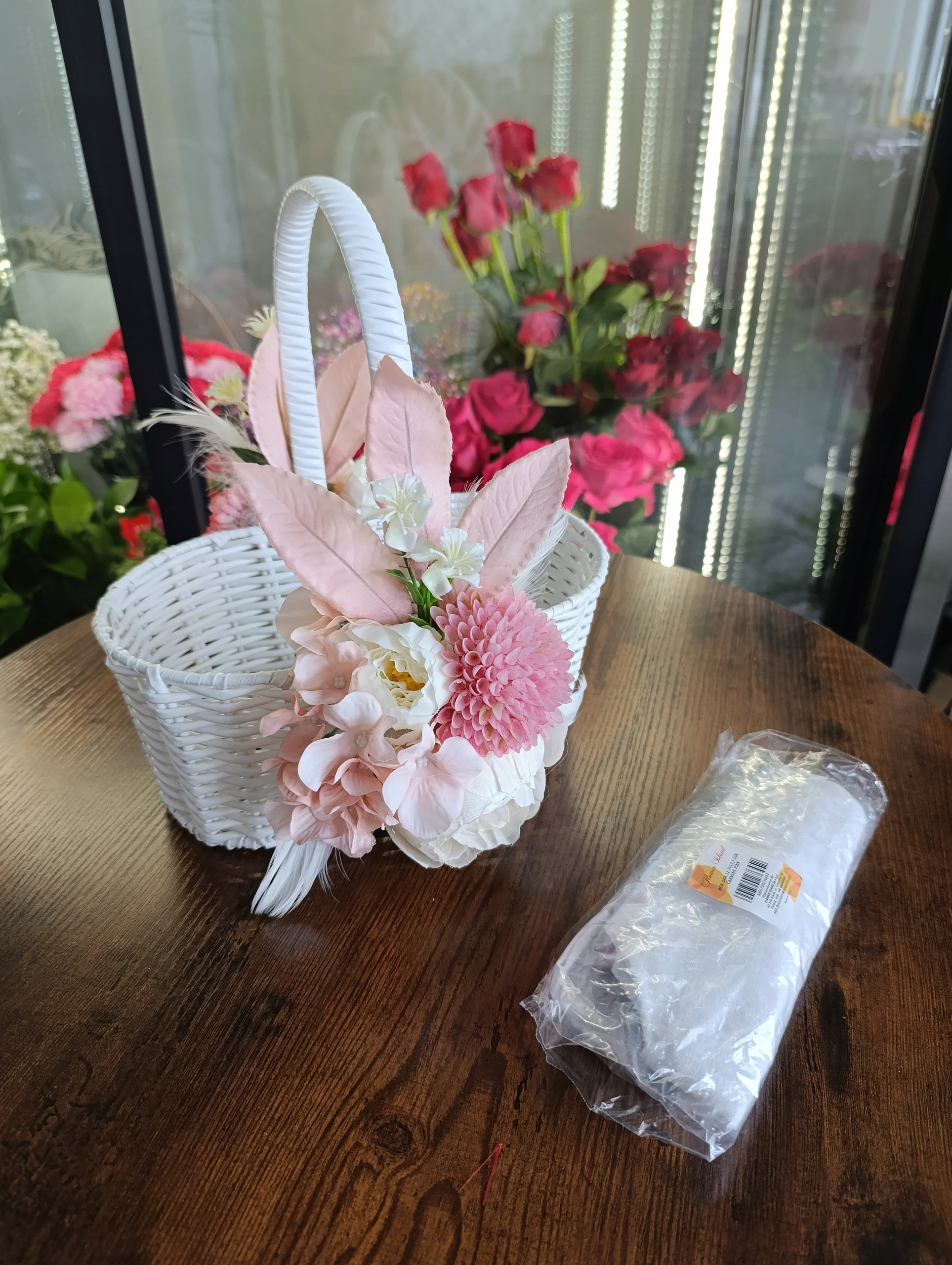 Корзина и украшения изготовлены из высокого качества b> и материалов, которые гарантируют долговечность и эстетическую внешность. с обеих сторон корзина, как вы можете видеть на фотографиях. Оформление включает в себя зеленые аксессуары и искусственные цветы. Каждая композиция сопровождается декоративной салфеткой