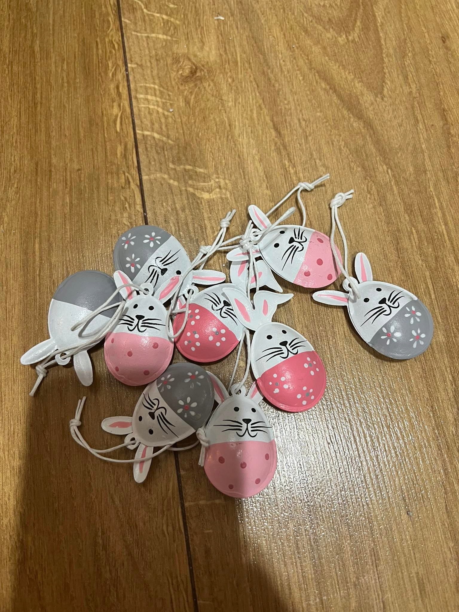 Содержимое: 9 декоративных ПОДВЕСОК. Размеры: примерно 6х3,5 см. Материал: металл, пластик. Цвет: белый, розовый, серый, черный. Выкройка: Пасхальный кролик.