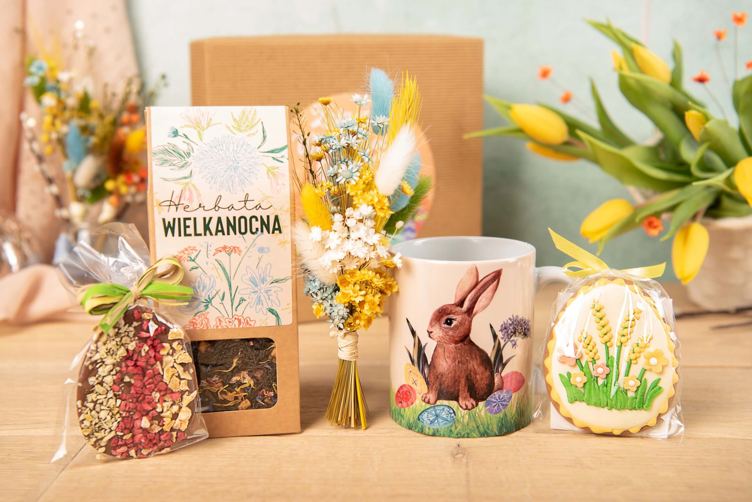 Это идеальный подарок для любителей чая и сладостей. В нем ароматный чай, очаровательная кружка с пасхальным мотивом, пряники в форме пасхального яйца и букет сухоцветов. Все упаковано в декоративную коробку и готово к дарению.