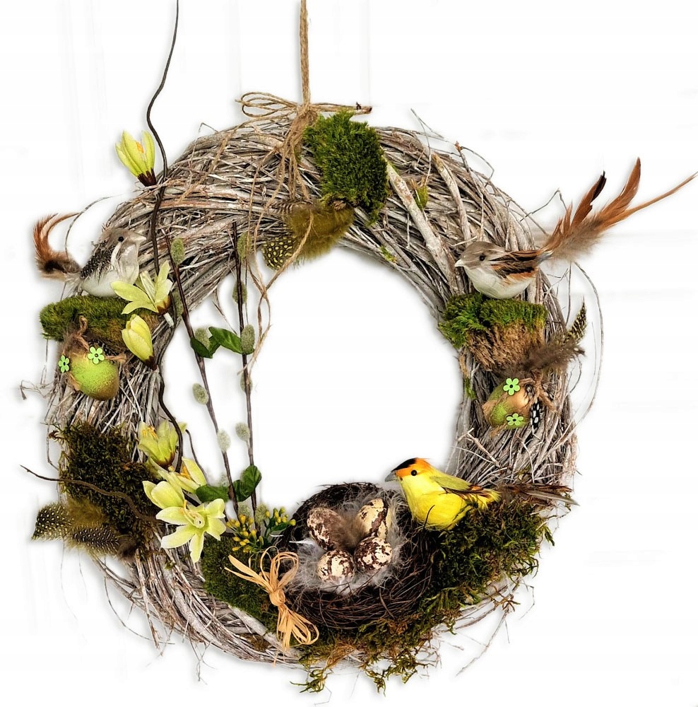 НАТУРАЛЬНЫЙ ВЕНОК, УКРАШЕННЫЙ СТАБИЛИЗИРОВАННЫМ МХОМ, ПТИЦАМИ, ПЕРЬЯМИ, ПЕРЬЯМИ ФОРИСТИЯ И ЩЕЛЧКАМИ. ГНЕЗДО С ЯЙЦАМИ ПРИДАЕТ РОЖДЕСТВЕНСКИЙ ХАРАКТЕР
