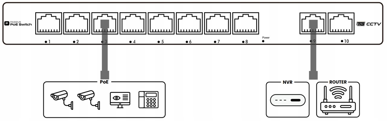 - Тип переключателя: пассивный переключатель PoE 8+2