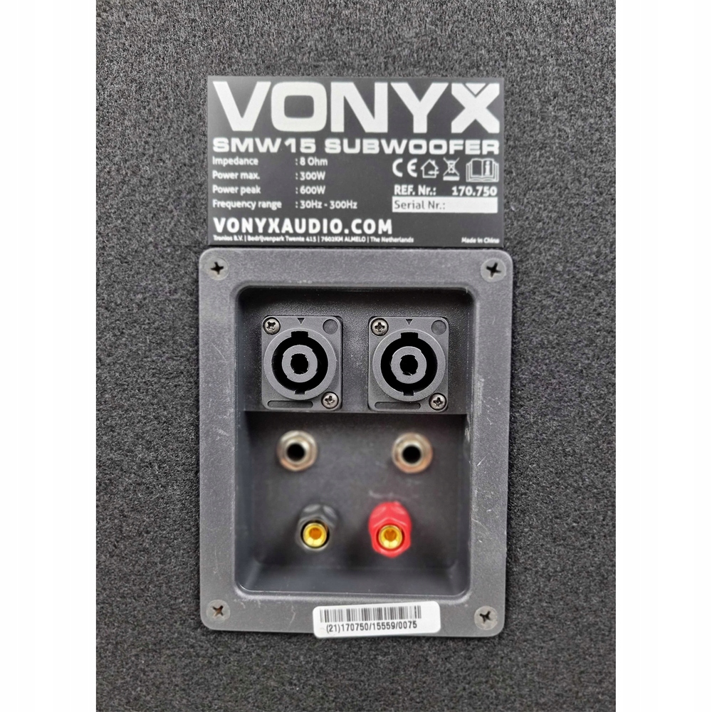 Профессиональный сабвуфер со среднеквадратичной мощностью 600 Вт и 300 Вт, Vonyx SMW15. Пассивный сабвуфер имеет встроенный фильтр нижних частот, обеспечивающий глубокий и мощный звук басов. Он оснащен 15-дюймовым сабвуфером, т. е. диаметром 38 см.