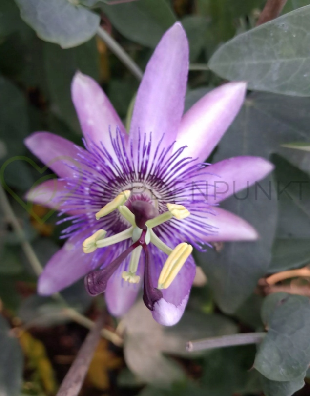 Его иначе называют Цветком Страстей Господних. Это многолетняя виноградная лоза, которая растет довольно быстро. Достигает около 3 м в высоту, а при выращивании в горшках может достигать 1 м – требует опор и взбирается с помощью усиков. Побеги тонкие и гладкие. Листья полувечнозеленые – часть листьев зимой опадает, а часть остается. Они зеленые, с 5-7 сильно изрезанными створками. Цветет с июня по октябрь. Разноцветный фиолетовый центр, с кольцом из синих и белых нитевидных шнурков, ок. 8-10 см в диаметре. Они красиво пахнут и медоносны. Из него получаются съедобные плоды (маракуйя), богатые витамином С. Мякоть используют для приготовления соков, желе и прохладительных напитков. Предпочитает солнечные, полутенистые, теплые и защищенные места. Лучше всего растет на плодородной, проницаемой, умеренно влажной почве с нейтральным pH. Чтобы стимулировать рост, можно обрезать растение ранней весной. Если он выращивается в контейнерах, то лучше всего на зиму перенести его в помещение, где температура будет около 8-12 градусов Цельсия.
