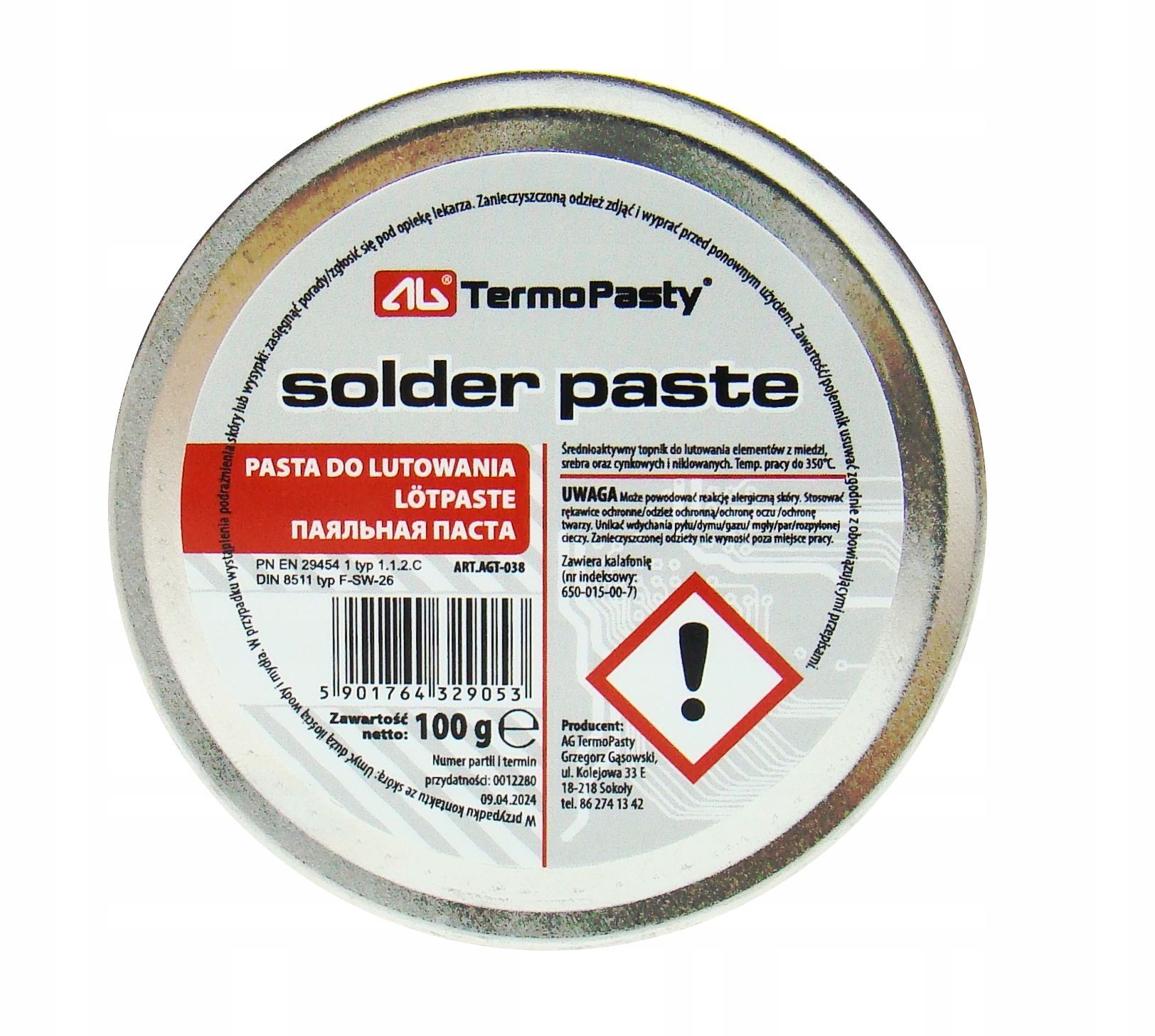 Паяльная паста AG Termopasty изготовлена на основе канифоли и содержит флюс средней активности. Продукт облегчает пайку компонентов с элементами из меди, серебра, цинка и никеля. В радио- и коммуникационной технике и при сборке электронных устройств его применяют для отбеливания и пайки. Не стоит беспокоиться, что остатки вызовут коррозию цветных металлов. Ненужные остатки следует смыть спиртоудалителем, поскольку паяльная паста не растворяется в воде.