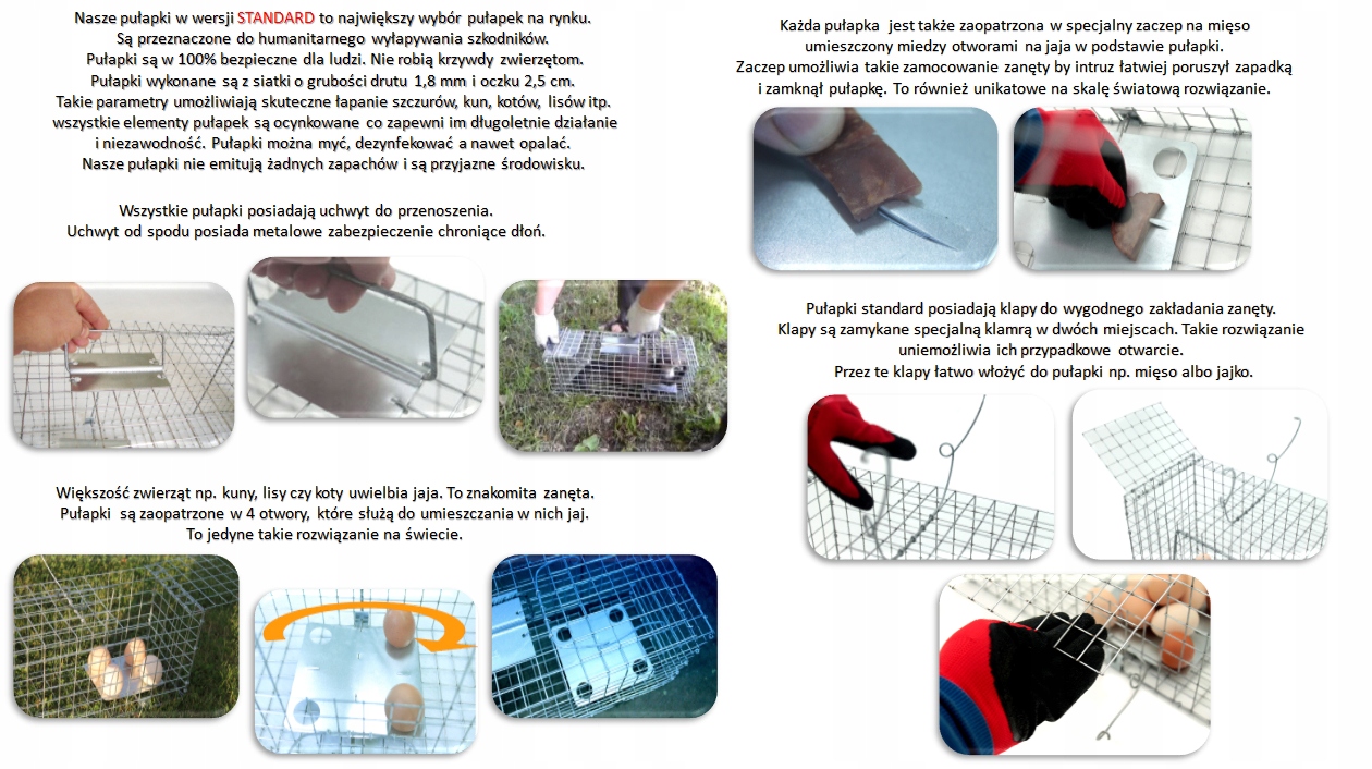 ЛОТОК НА 4 ЯИЦА!!!! Ловушка имеет 4 отверстия для приманки в форме яйца — любимого лакомства грызунов, в том числе куниц, ласк, крыс, а также кошек, лисиц и выдр. Это увеличивает вероятность срабатывания защелки на 300% по сравнению с традиционными ловушками с одним яйцом. Единственное такое решение в мире... при потере очередного яйца чувствительность ловушки увеличивается, при потере еще одного яйца чувствительность возрастает еще больше или ловушка закрывается исходя из преимущества массы яйца над одним сторона. Такое решение означает, что мы можем загрузить сразу 4 яйца и спокойно ждать злоумышленника.