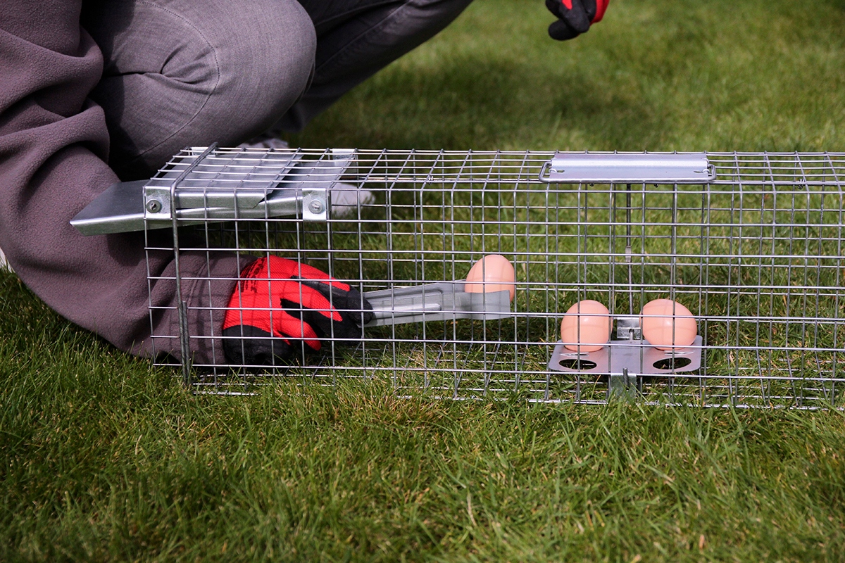 Живоловка оснащена специальной подвеской, на которую можно разместить наживку, например яйца или гранулы с сильным запахом, которые входят в комплект. Лоток для приманки облегчает ее размещение, а входящие в комплект щипцы обеспечивают безопасность при манипуляциях с приманкой.