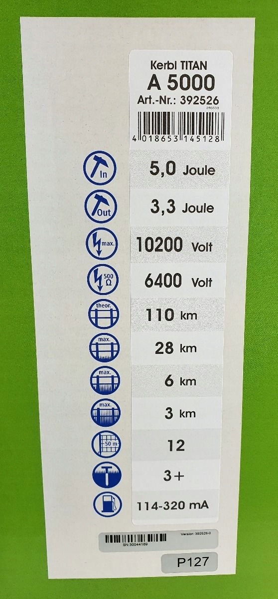 - оснащен импульсной технологией KERBL TITAN A5000 – с микропроцессорным управлением – намного безопаснее, энергосберегающе и, в случае сильного роста, значительно лучшая защита благодаря очень высокому напряжению
