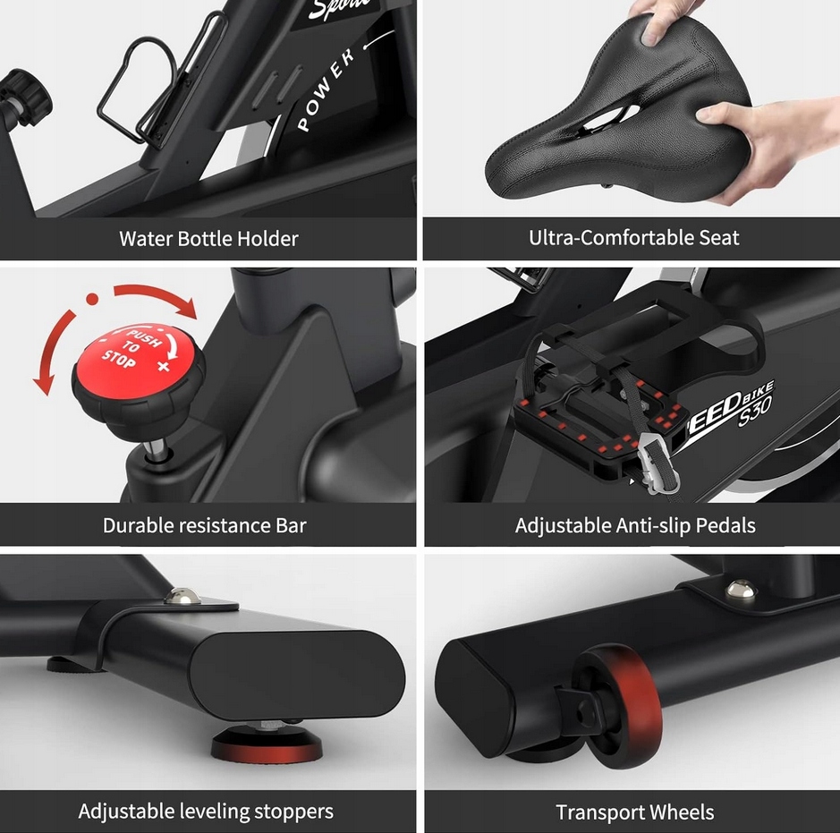 - 【SOLIDNIE ZBUDOWANY ROWER STACJONARNY】 Десятигребная модель S30 ma grubszą rurę ramy и многотреугольная конструкция рамы с эффективной грузоподъемностью до 150 кг, которая преодолевает неустойчивость большинства других велотренажеров и обеспечивает безопасную езду на велосипеде.