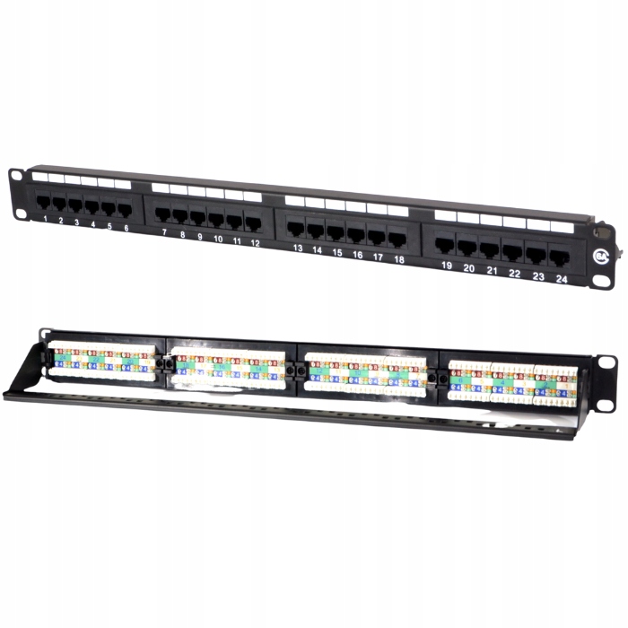 Патчпанель — это завершающая часть кабельной структуры в шкафу RACK. Это устройство соединяет кабели, выходящие из шкафа, с кабелями, установленными в шкафу, и подключает последующие устройства. Патч-панель имеет стандартные размеры для 19" стойки и высоту 1U. Каждый разъем пронумерован, внутри имеется полоска с разъемами, установленными вертикально.