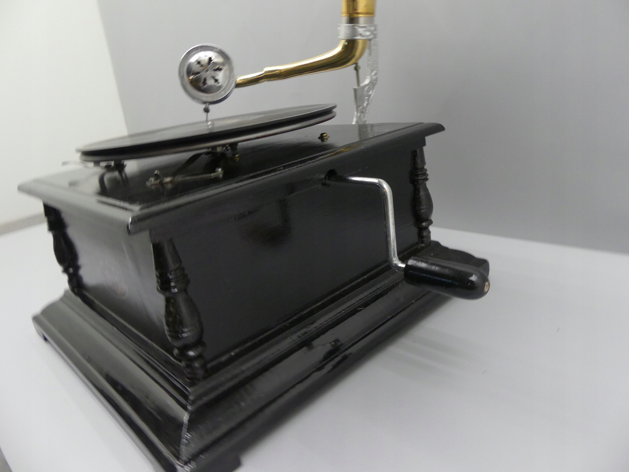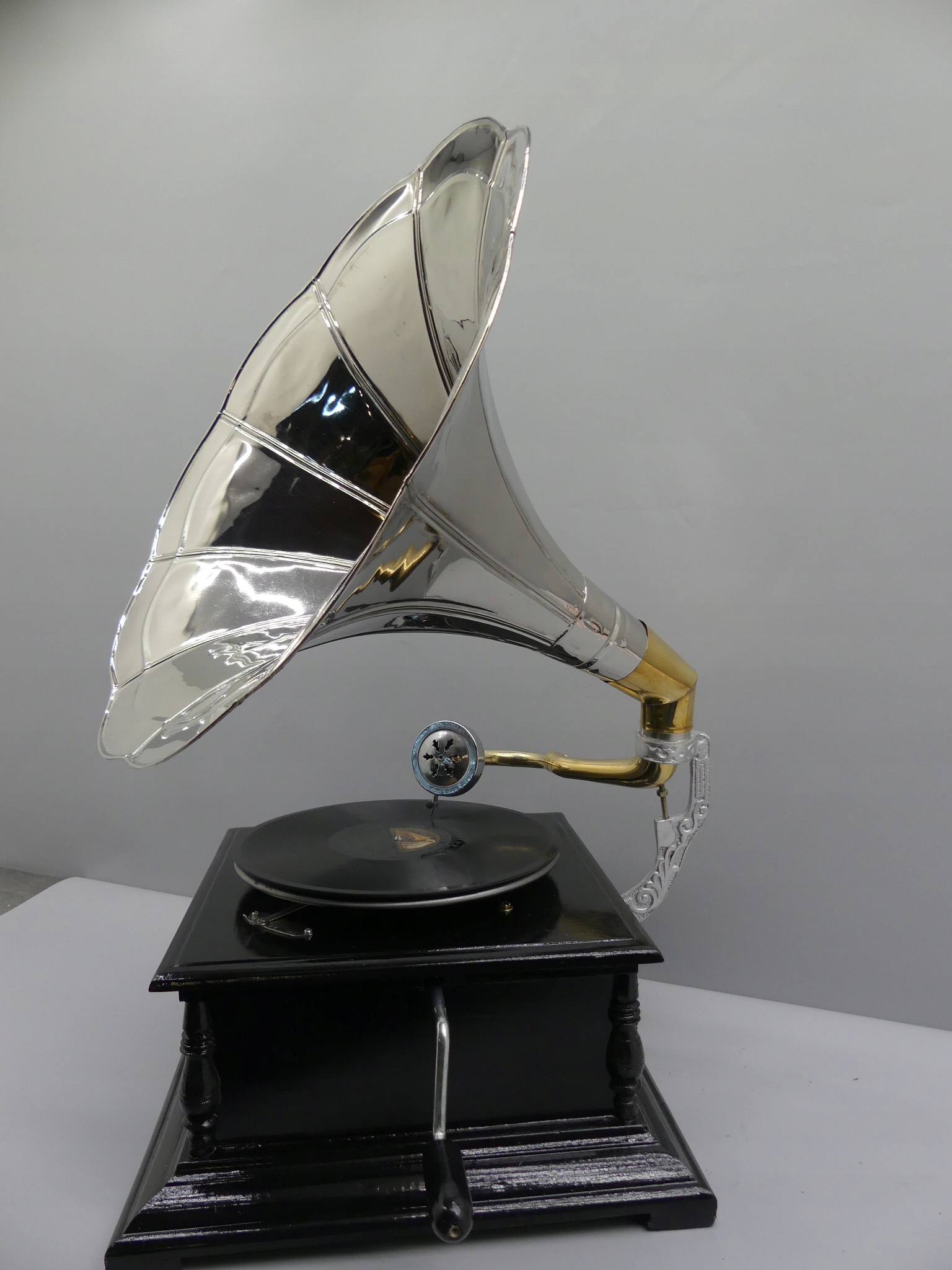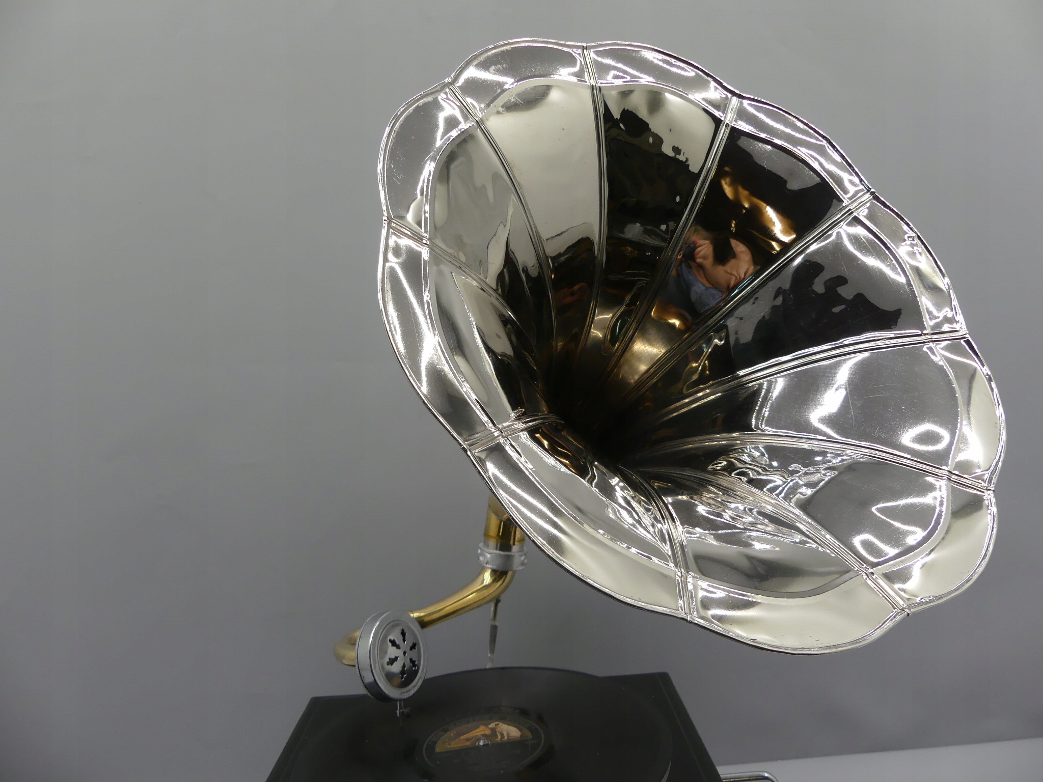 - Красиво оформленный граммофон — сочетание серебряной трубки с деревянным квадратным основанием.
